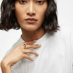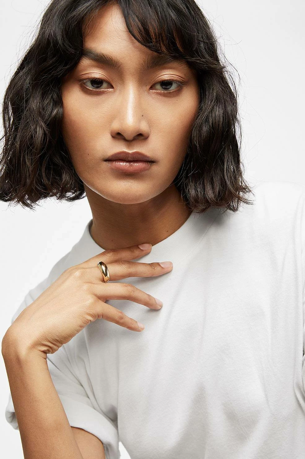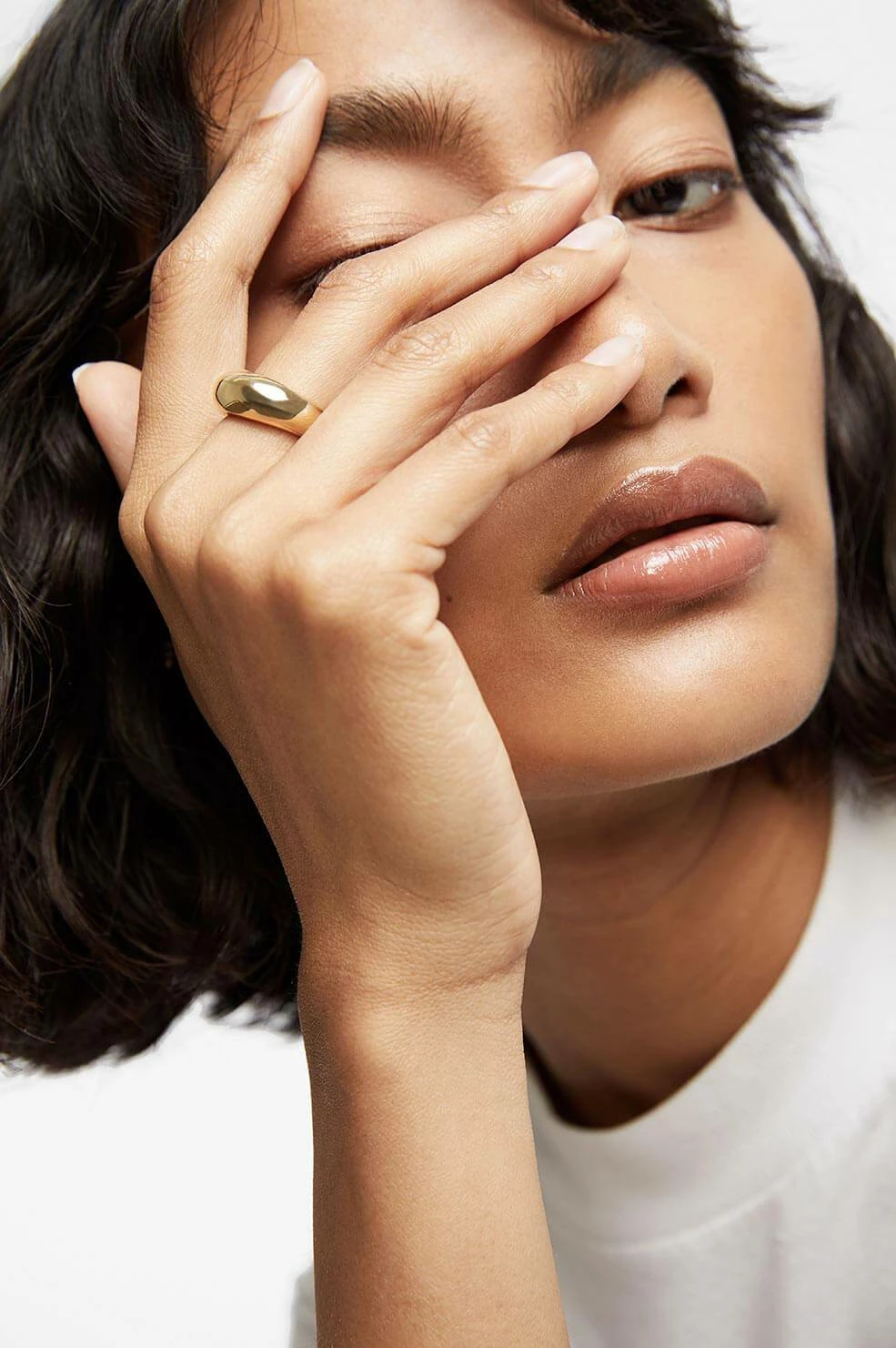 The Anine Bing Dome Ring is an everyday accessory that features a smooth, minimal half-dome shape that is bold yet timeless in its simplicity. The Dome Ring is designed to stack in multiples of two or opt to wear it as a single for a more understated outcome.
