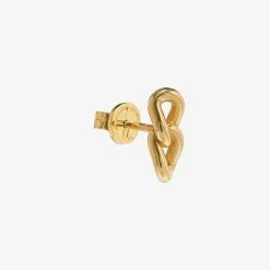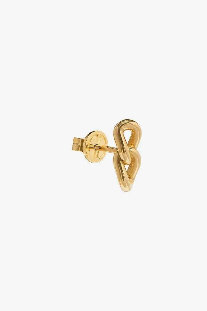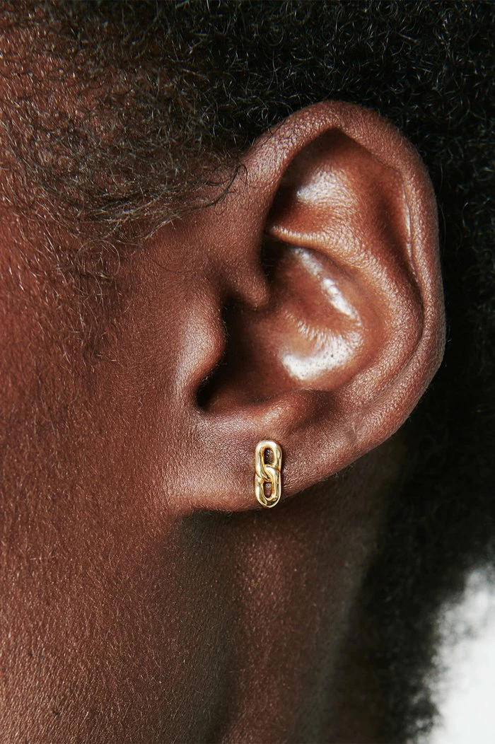 The Anine Bing Mini Double Link Stud in Gold. An understated stud featuring two flat, interlocked links crafted in solid 14k gold. This earring includes a classic butterfly back engraved with ANINE BING branding.