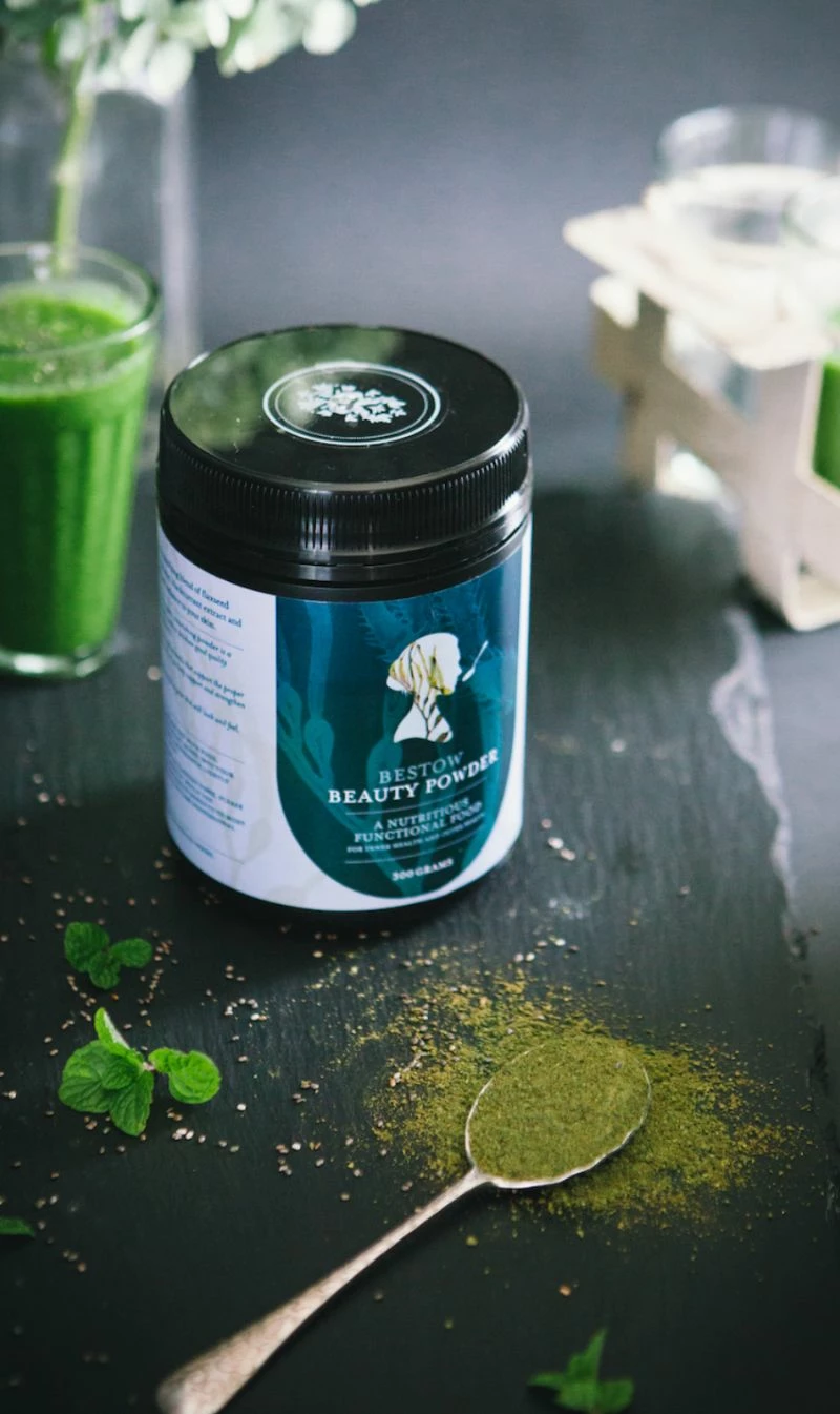 BESTOW BEAUTY POWDER is a delicious, beautifying blend of nutrient-rich plants, designed to bestow health and radiance to your skin.