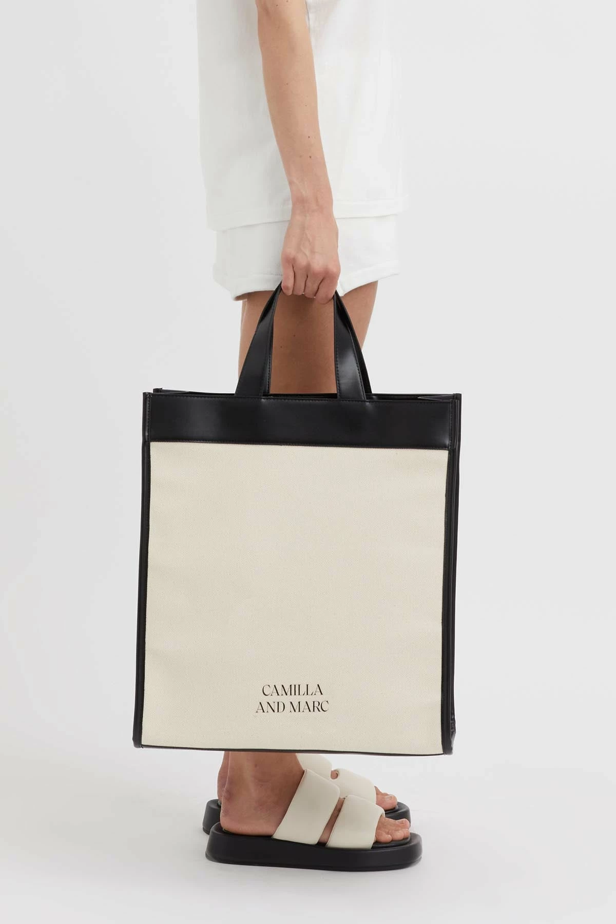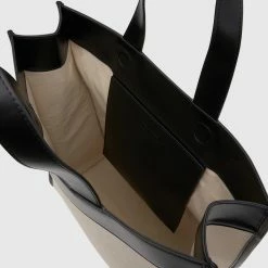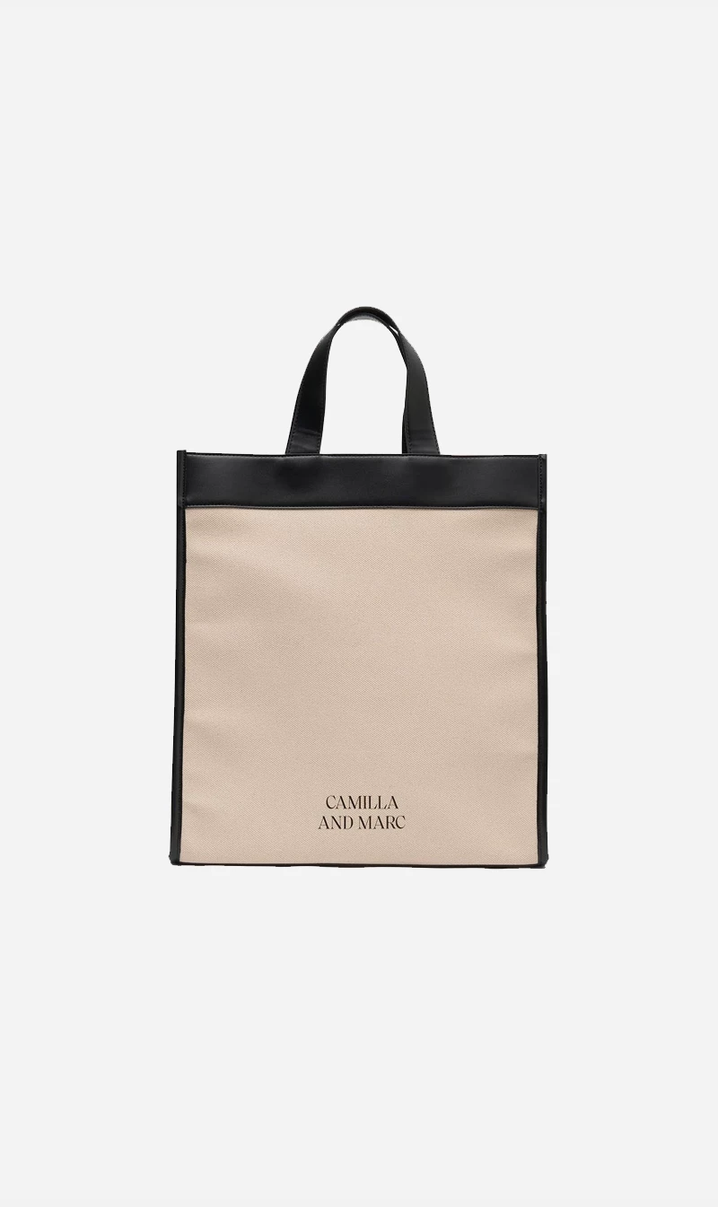 - Portrait tote with spacious interior in organic canvas with stitched contrast binding in pu.