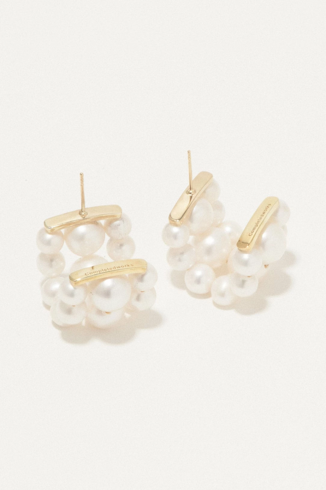 The Completed Works P30 Earrings With Fresh Water Pearls in 14ct Gold Plated. Strands of freshwater pearls form a graceful arc in this subtly dramatic piece. Secured with earring posts and butterfly backs.