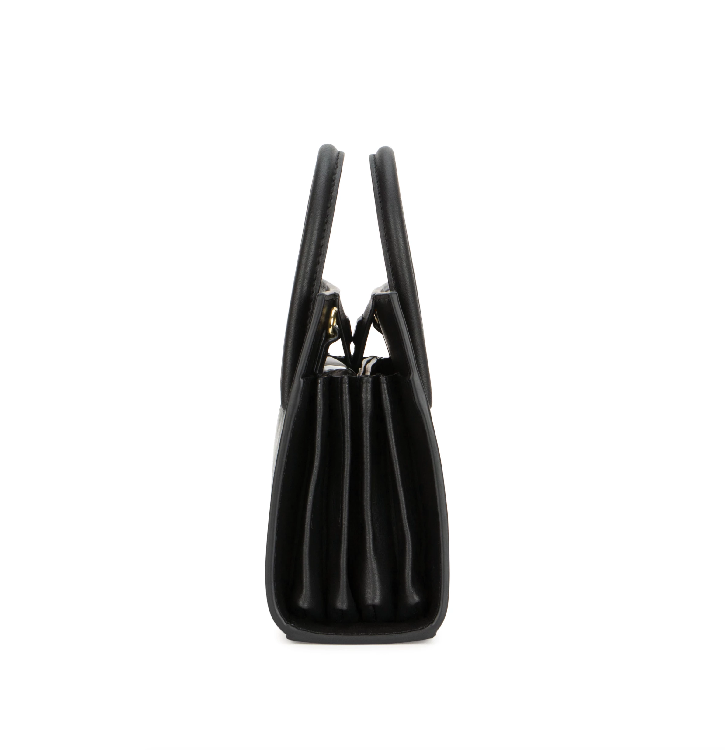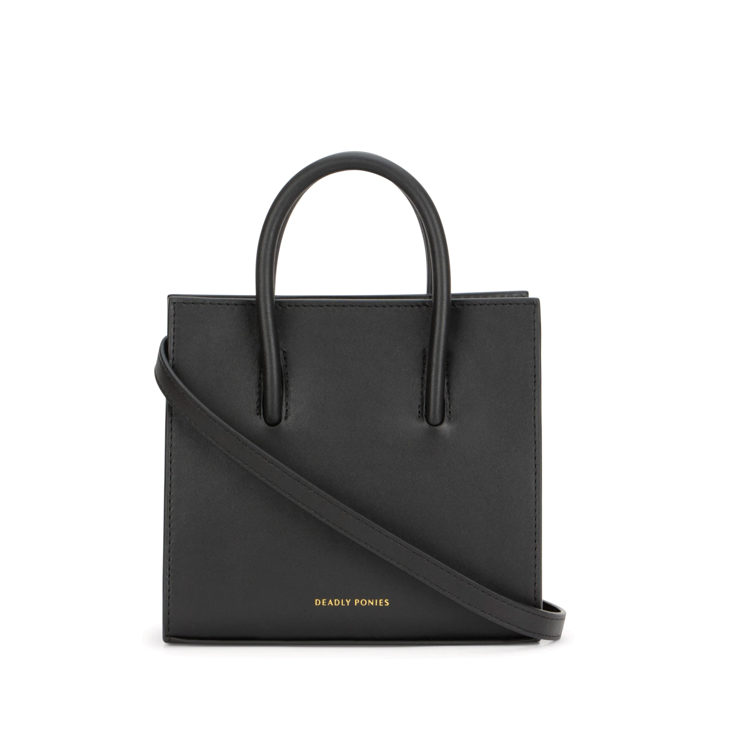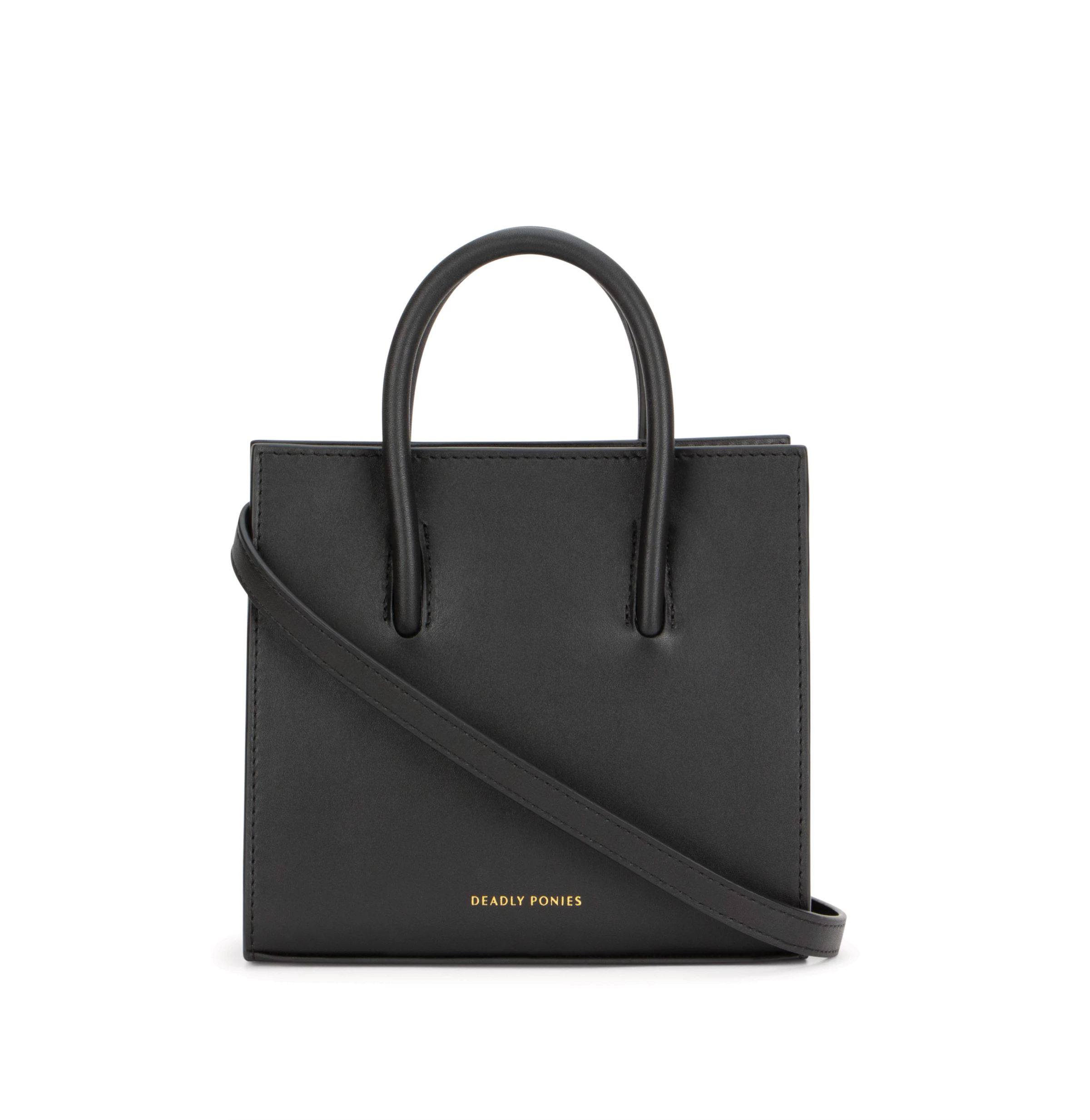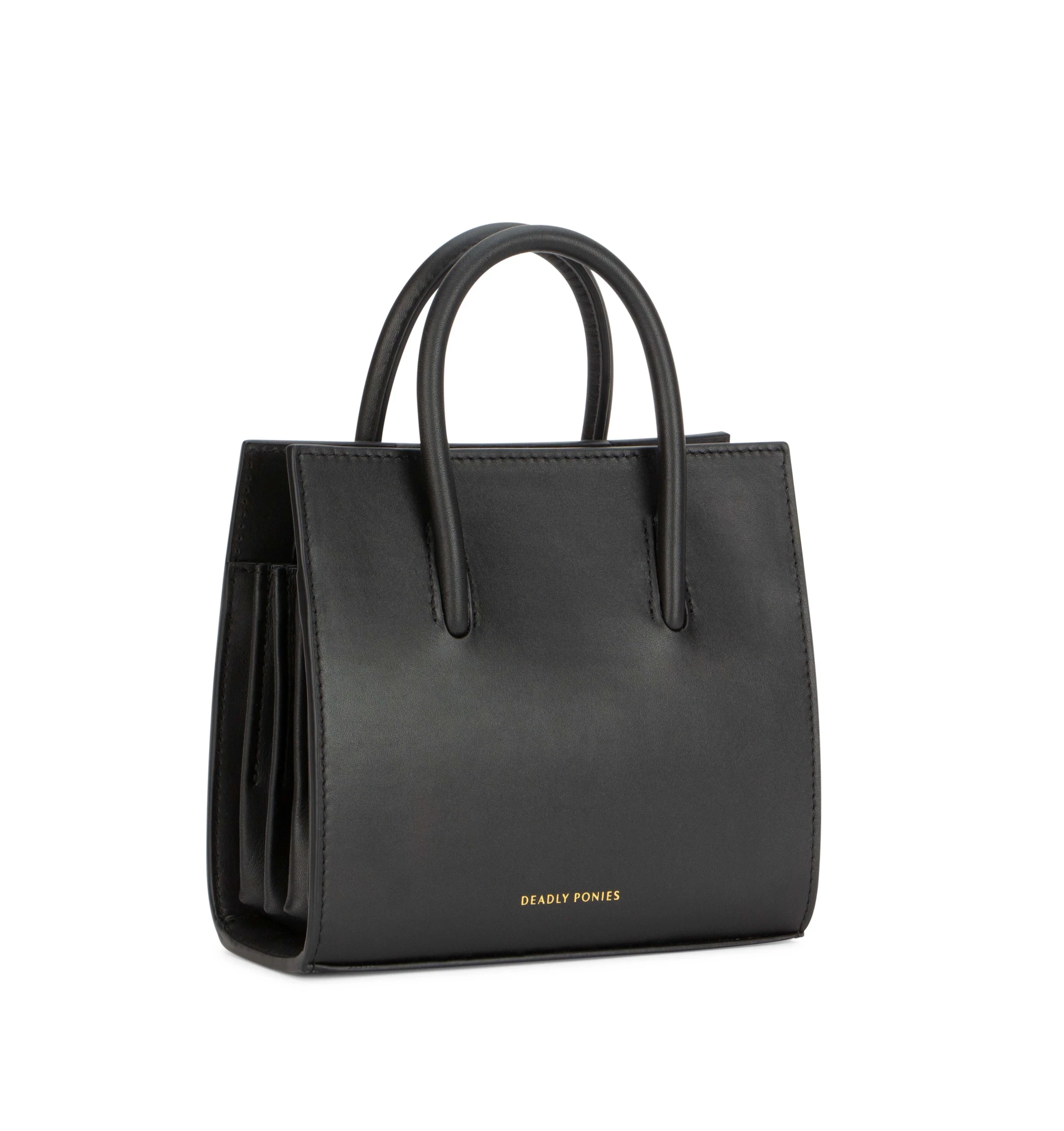 The Deadly Ponies Crush Tote Mini Calf Black. We’ve increased the size of our Crush Tote Mini, meaning there’s more to love of this highly covetable piece. Cute and compact, with accordian-style gussets, the Crush Tote Mini is versatile thanks to a detachable and adjustable shoulder strap, alongside structured top handles. A magnetic closure ensures everything you carry is kept safe and secure, while buttery soft Bovine leather makes for the perfect finishing touch.Â
