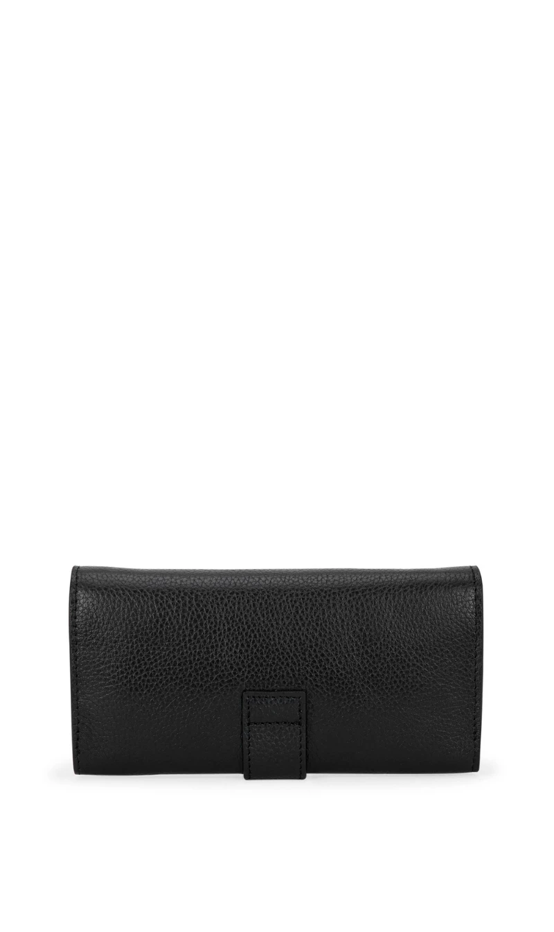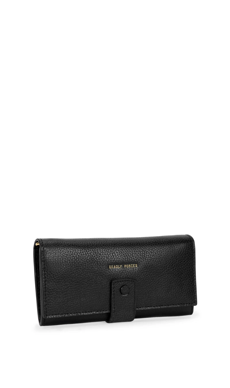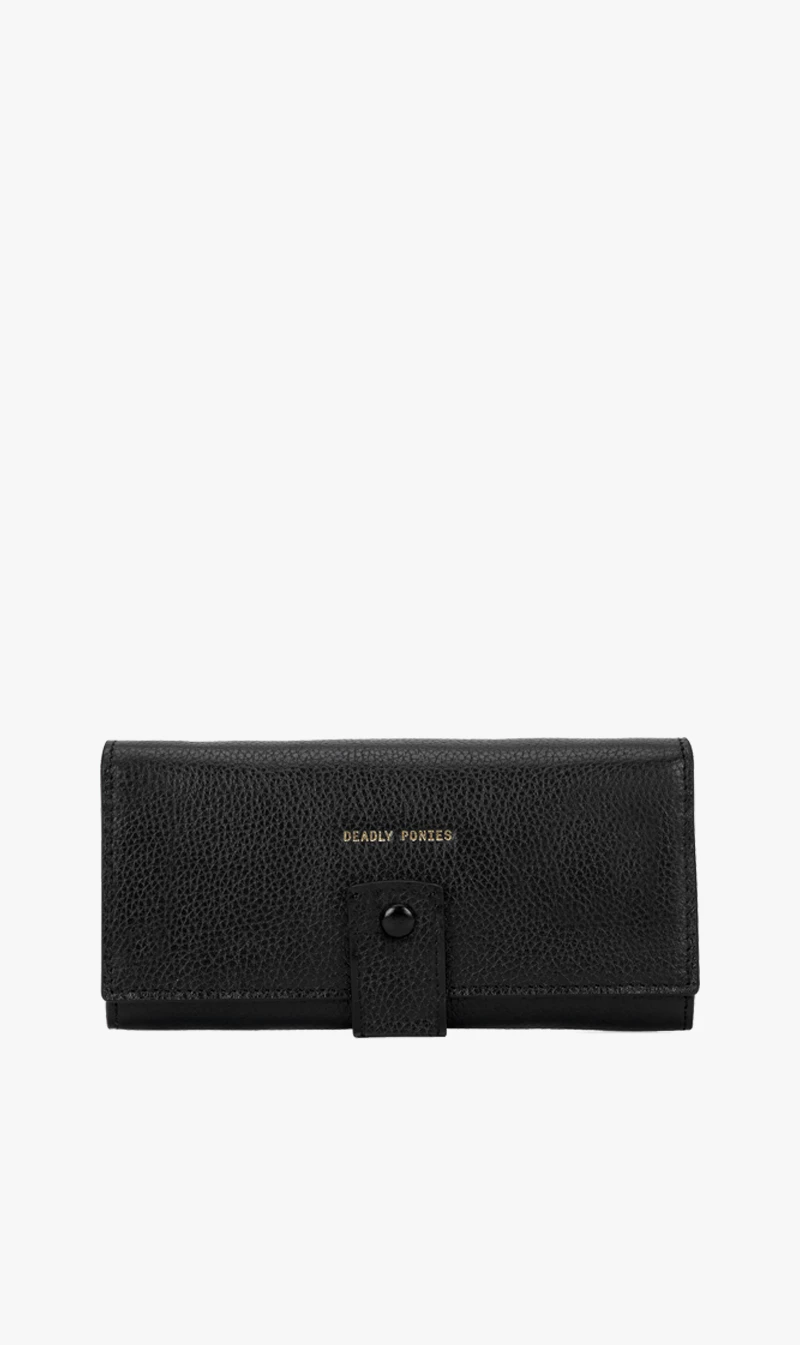Simplicity speaks volumes when it comes to Deadly Ponies Flip N Snap Maxi wallet. Spacious and secure, the Flip N Snap Maxi is landscape in design, and finished in sumptuous Bovine leather with solid brass hardware. A press stud closure secures thirteen card slots, three bill compartments and a zipped coin pocket. The Flip N Snap Maxi features leather tabs for the addition of a brass chain (available separately) so you can choose how you wish to wear it.
