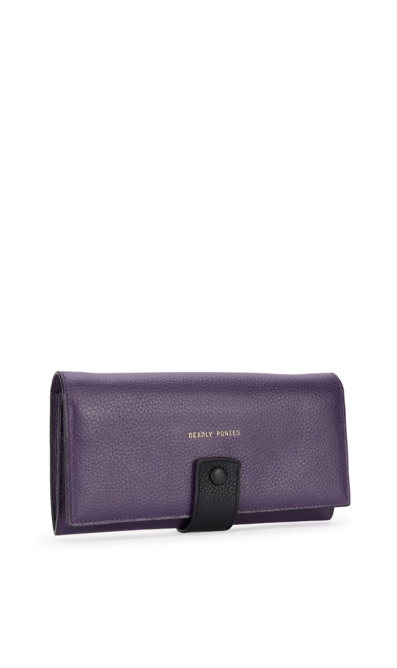 The Deadly Ponies Flip N Snap Maxi in Jam/Black will be your new on-the-go best friend. New this season with certified REACH cotton lining and a foldover dome closure, he’s spacious and secure, featuring a landscape design and finished in sumptuous Bovine leather with solid brass hardware. A press stud closure secures thirteen card slots, two bill compartments and a zipped coin pocket.Â