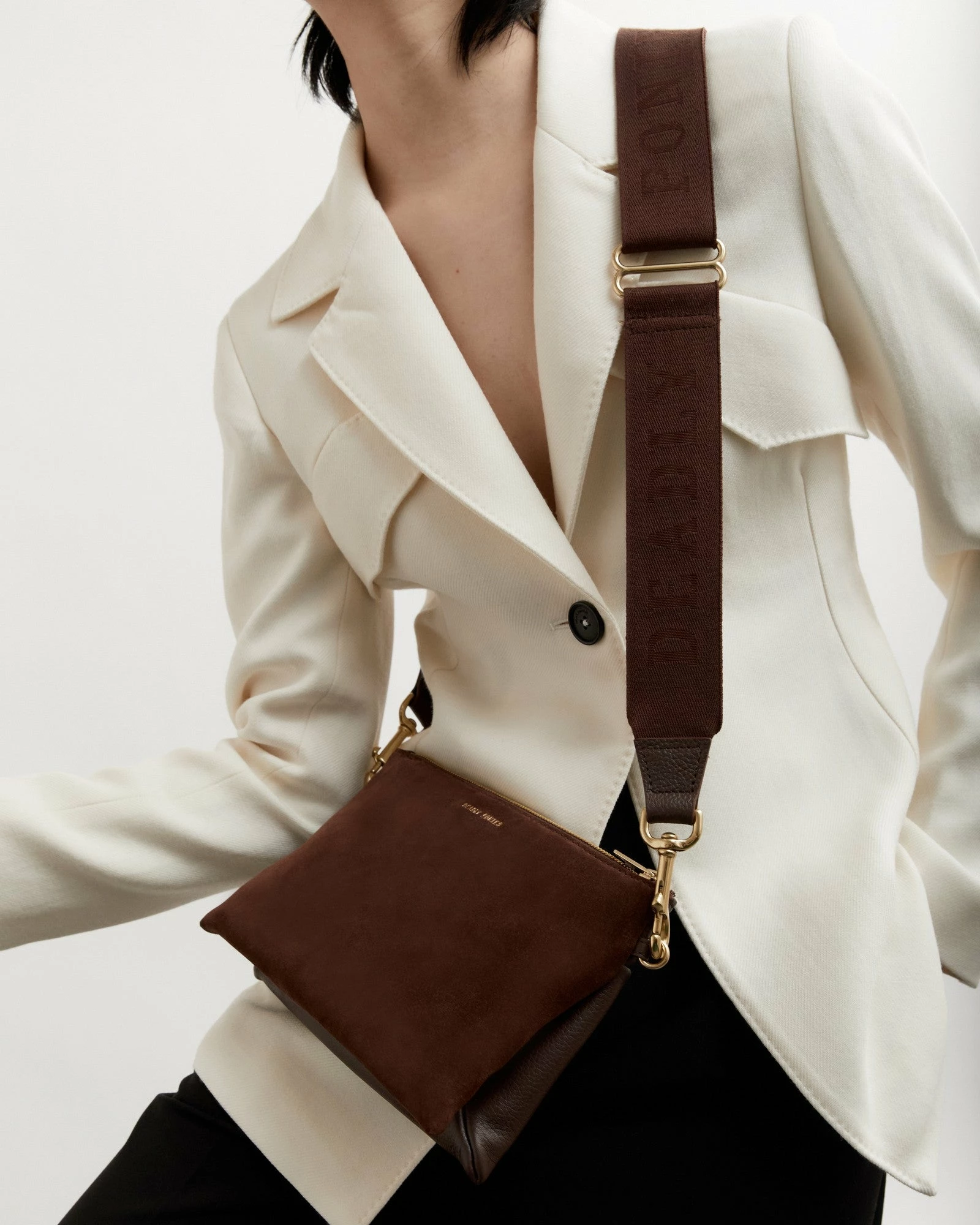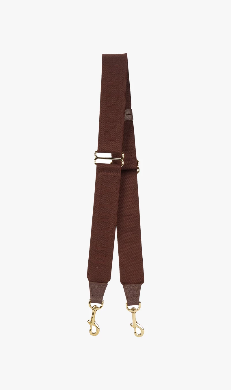 Introducing the Deadly Ponies’ Logomania Strap in Burnt Toast. From day to night, Deadly Ponies’ Logomania Strap is the most versatile companion, offering a quick update to your favourite bag, while providing comfort with its wide cotton strap featuring a woven logo detail and signature brass clicker.