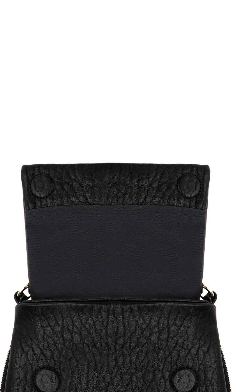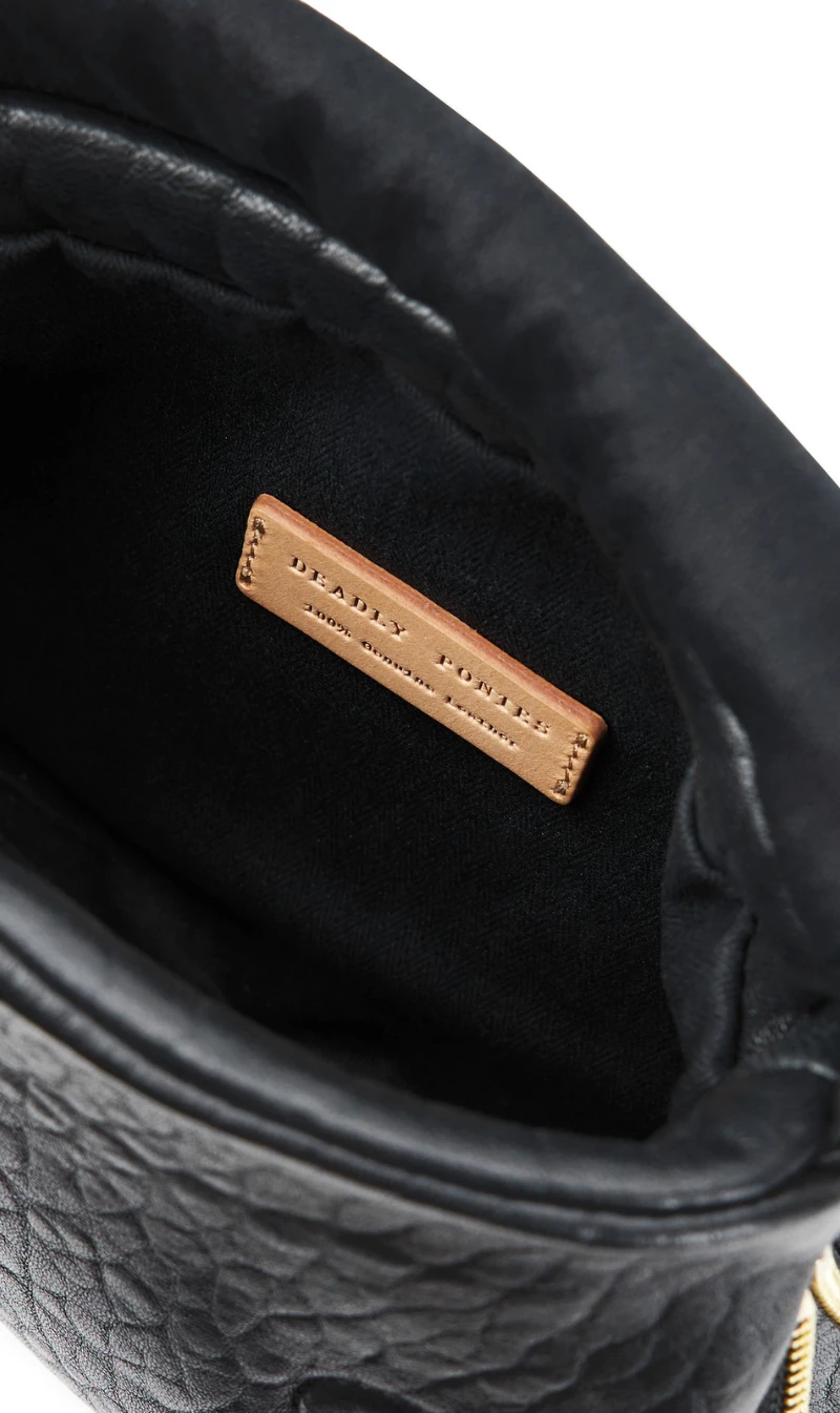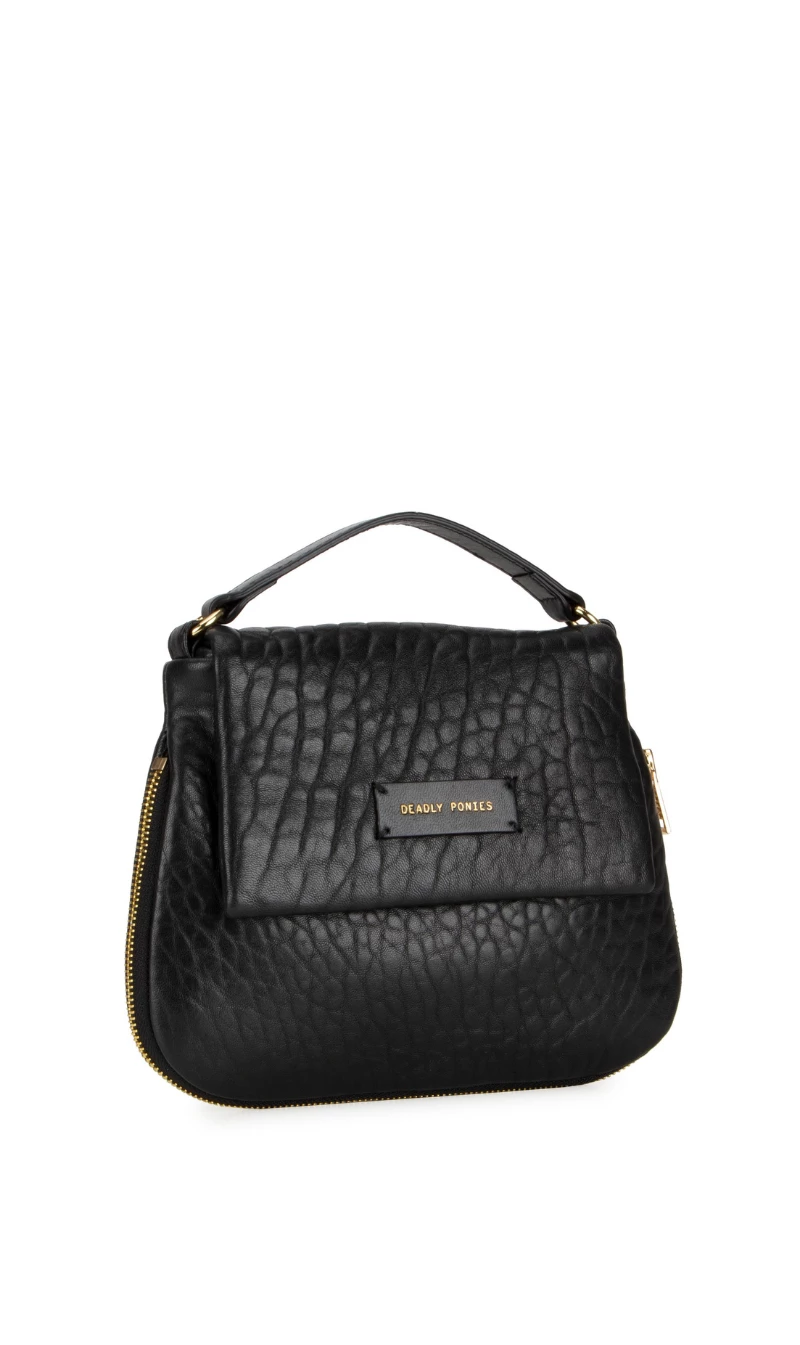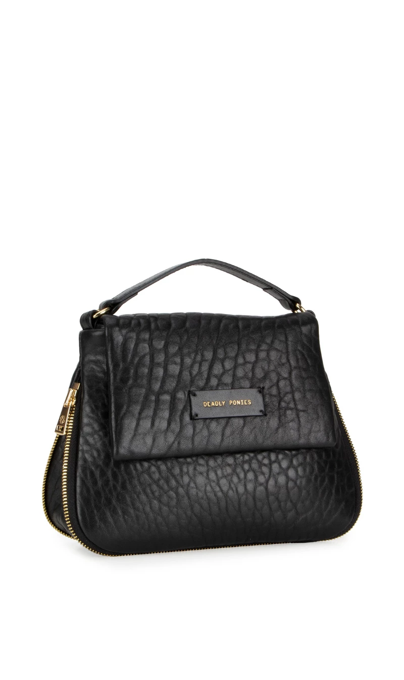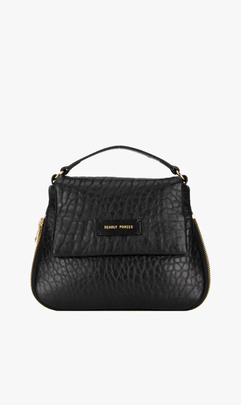 The Deadly Ponies Mr Caiman Mini is the cute and compact mini version of Mr Caiman Twist, there is more than meets the eye. Crafted in our iconic bulle leather, French for ‘bubble’, he is exceptionally textured, putting a twist on your classic black leather handbag.