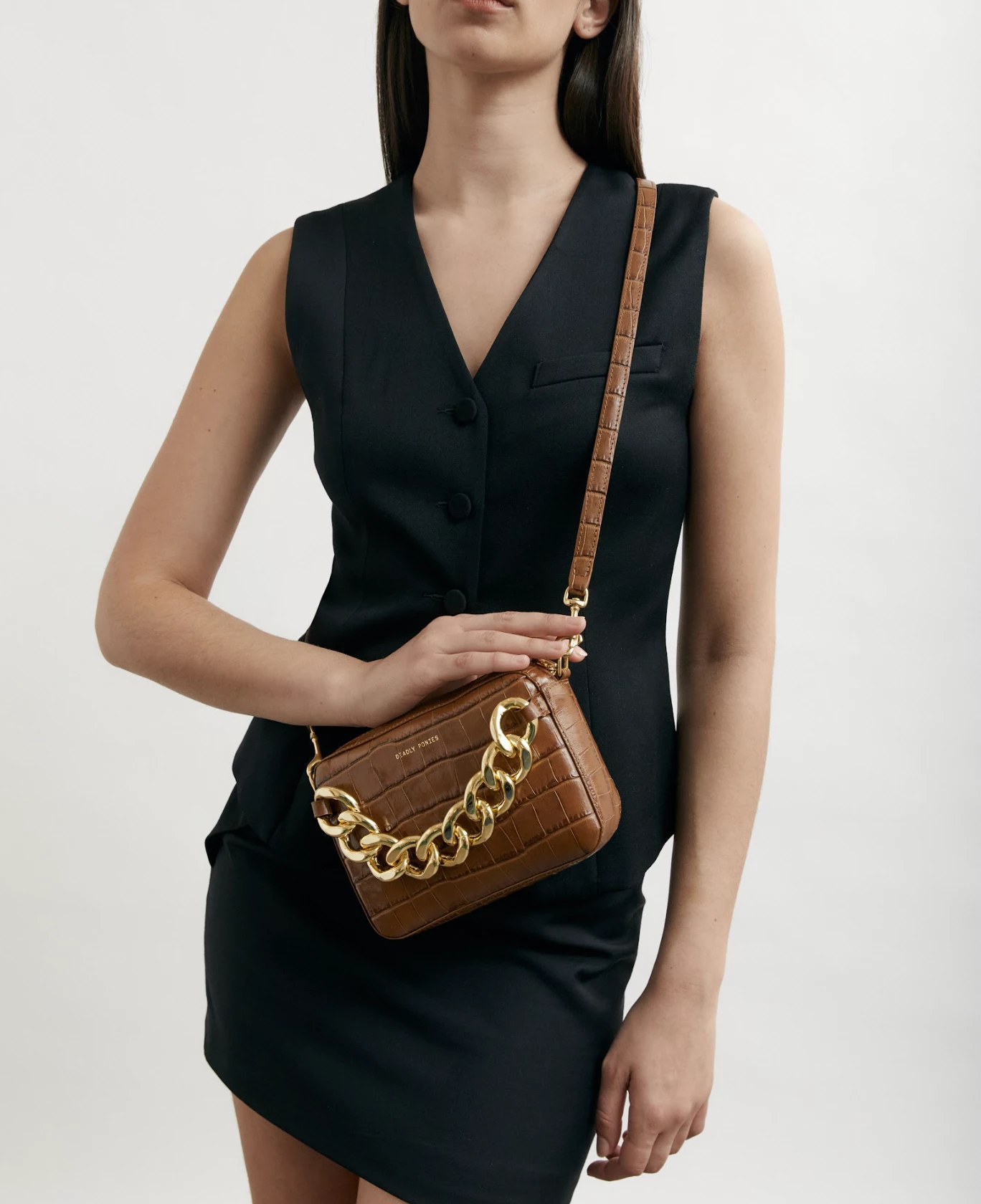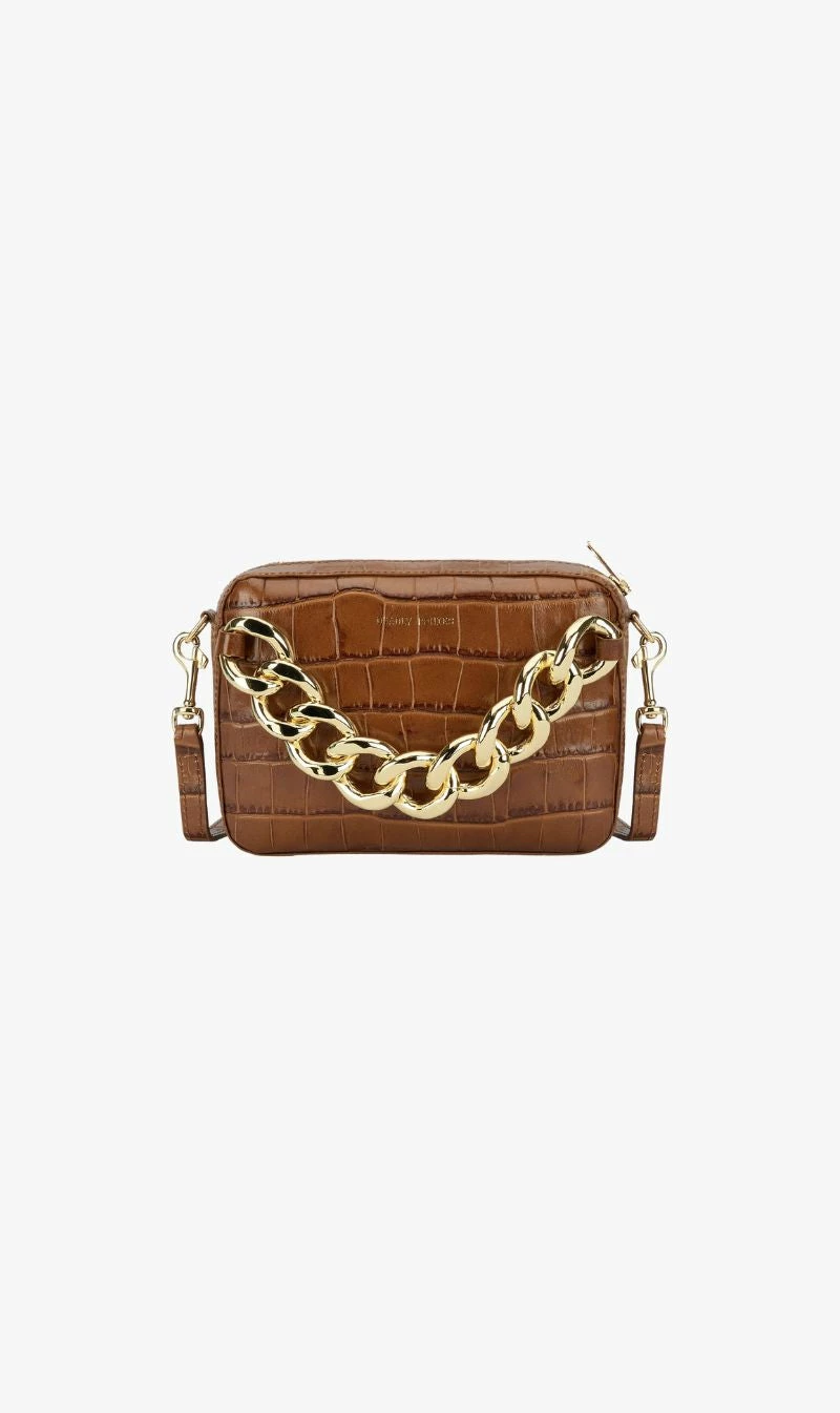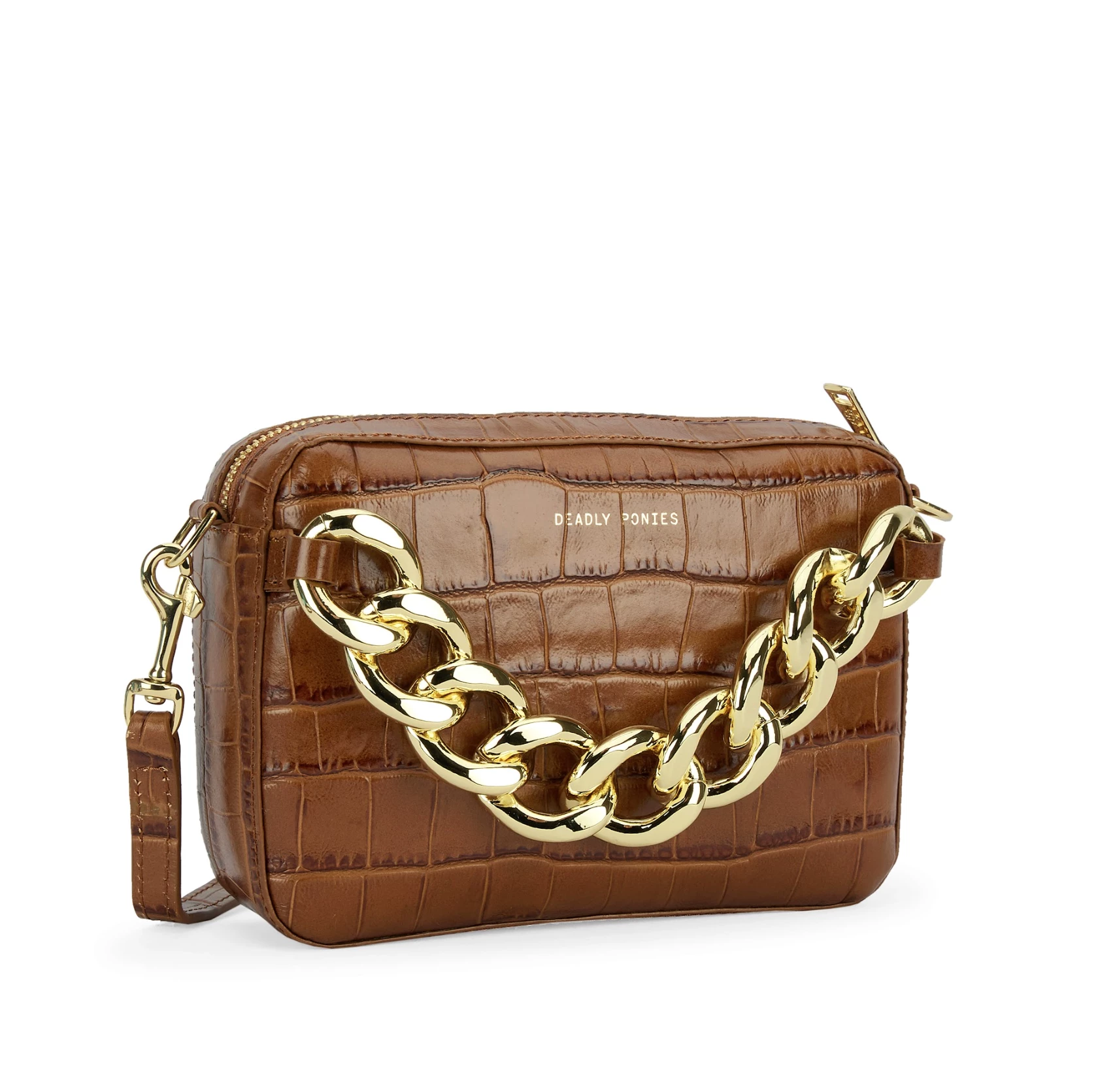 Meet the elegantly elevated Mr Cub Chain Mega-Croc from Deadly Ponies, this piece is the definition of a Deadly Ponies icon, with an extra chunky chain and brass hardware to ensure a fresh, eye-catching aesthetic. Clutch or crossbody – you decide, thanks to an adjustable detachable strap. An internal slip pocket and secure zip closure ensure your most loved essentials can be kept stashed away.Â