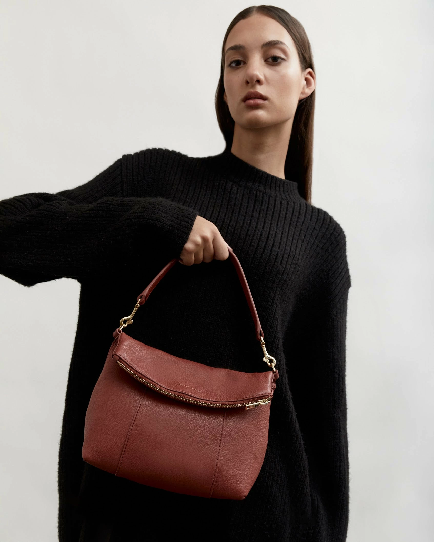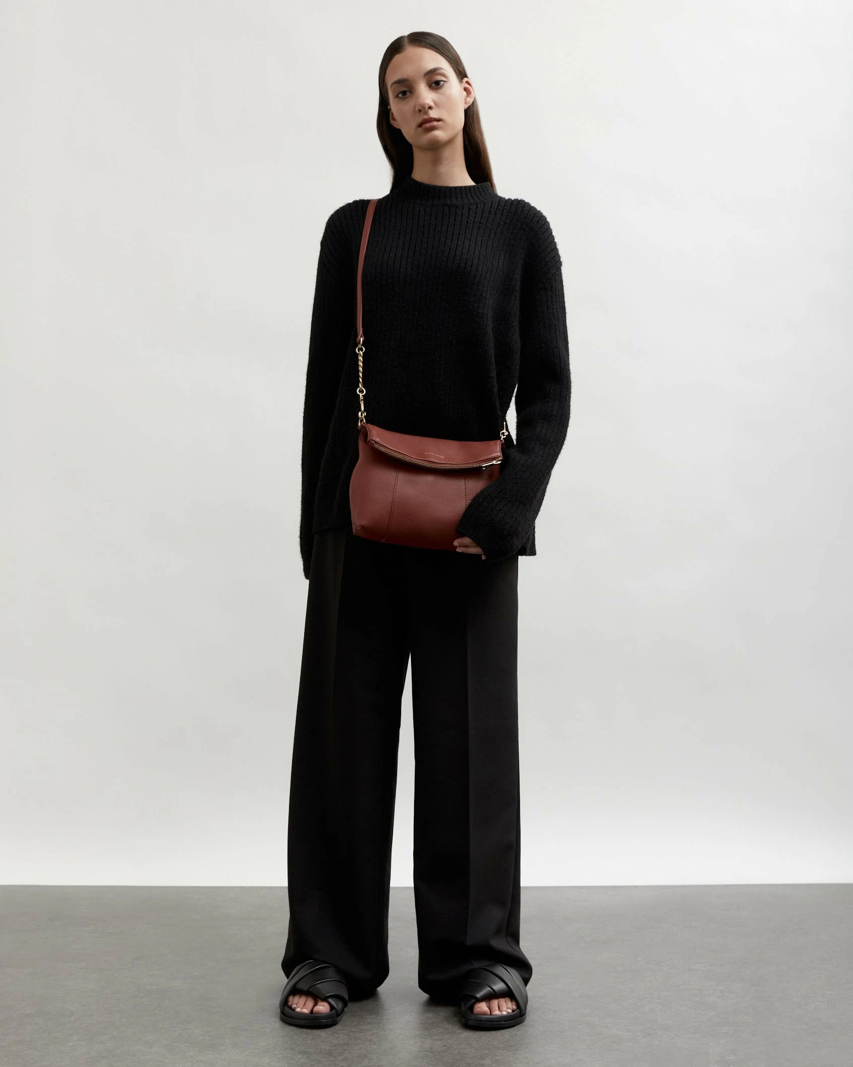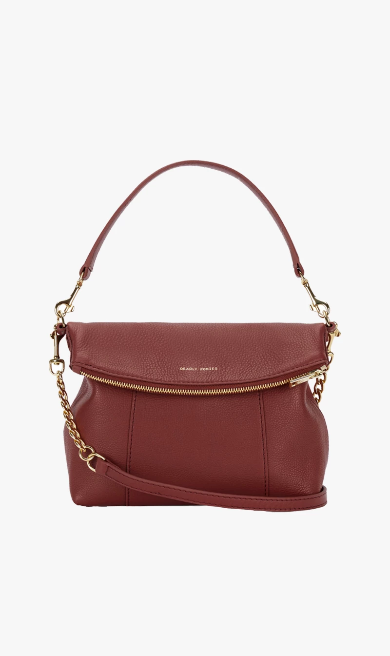 The Deadly Ponies Mr Mini Robin in Marsala is the perfect everyday bag, opulent in new season tones alongside signature brass hardware. Featuring a new detachable top handle with clickers, brass chain extension strap, and updated magnetic folding capability, he is as versatile as ever. The single-handle feature gives you options to wear as a go-to clutch bag or add the detachable chain for crossbody wear. Complete with two slip pockets and an interior zip for your extra essentials, Mr Mini Robin is quite simply, a Deadly Ponies classic.