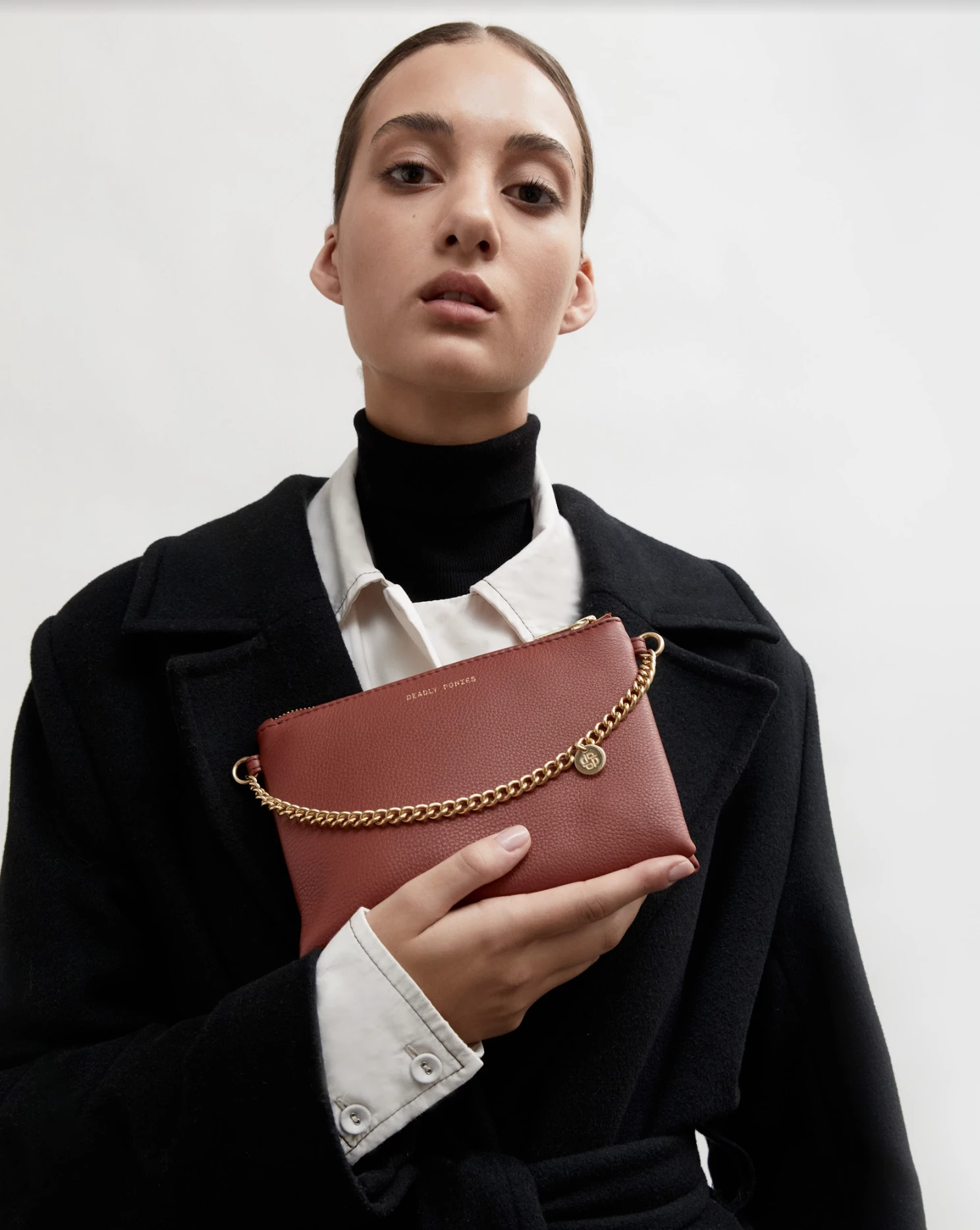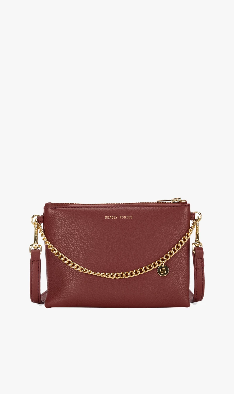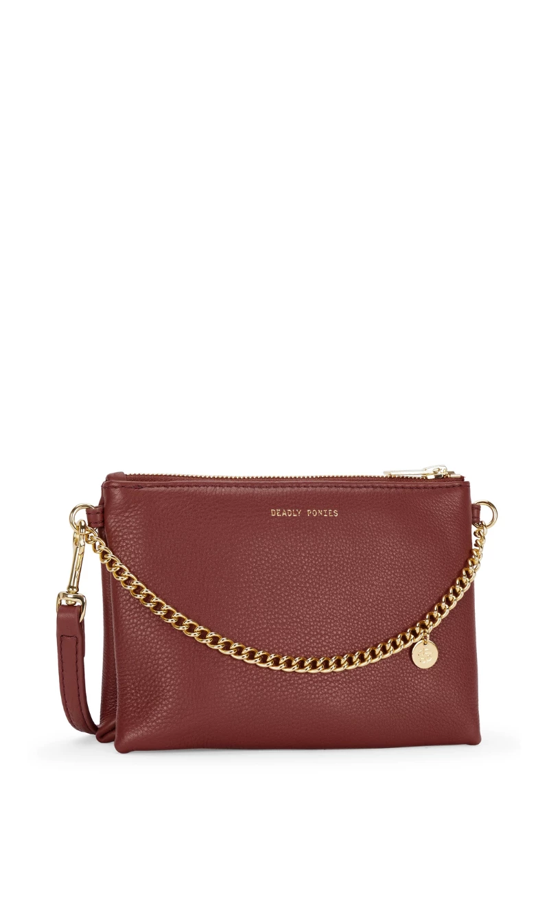 The Deadly Ponies Mr Minimese in Marsala is small in stature, yet mighty in style. Mr Making a name for himself as a highly coveted Deadly Ponies classic. This mini crossbody bag features a detachable and adjustable leather strap with front-facing brass chain detailing. An enviable companion for day or night – Mr Minimese is expertly handcrafted in buttery soft Bovine leather, while his surprisingly spacious silhouette features an interior double gusset and internal slip pocket. Exuding timeless luxury, Mr Minimese is ready to accompany you – season after season.