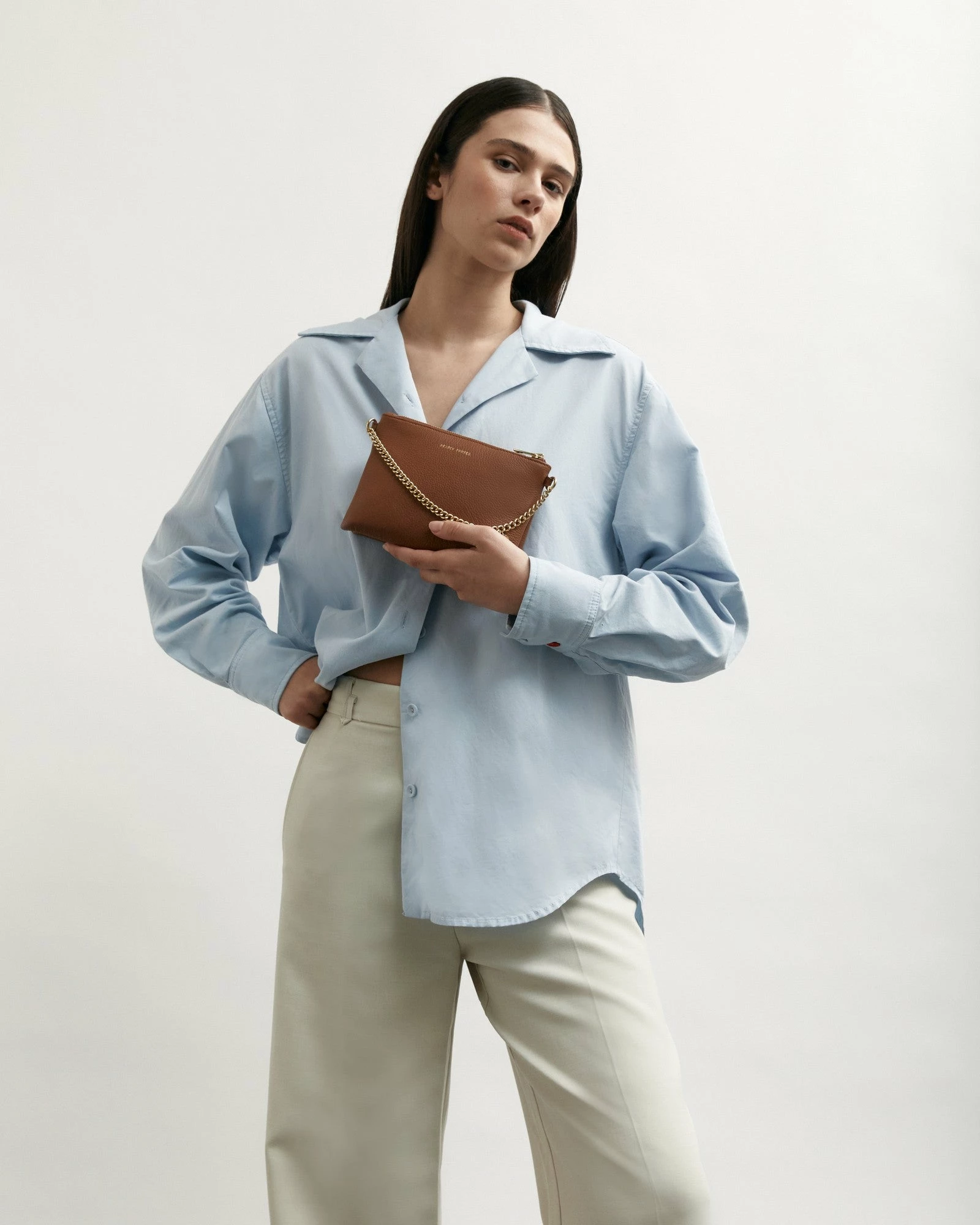 - Brass chain detail on the front