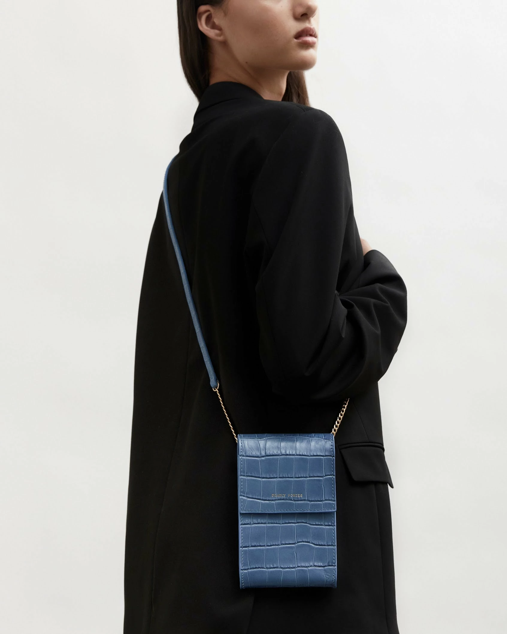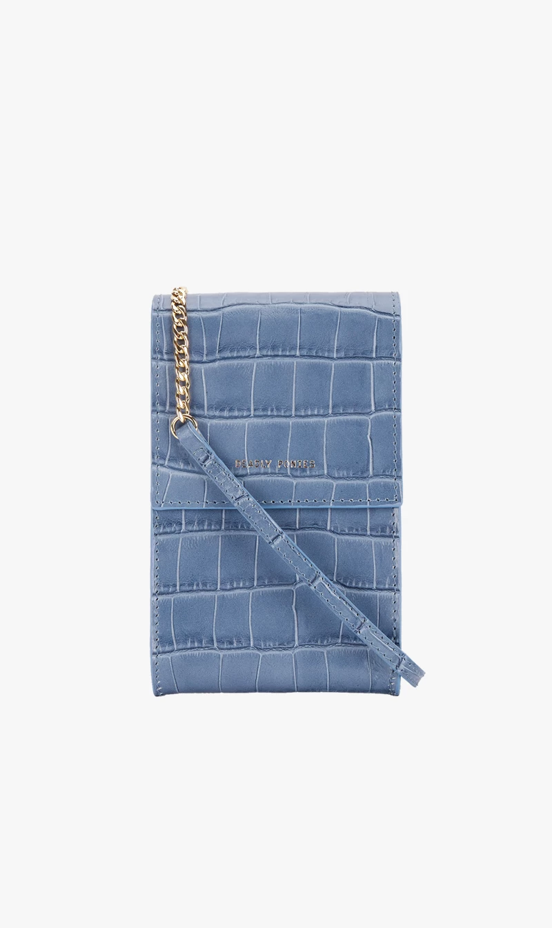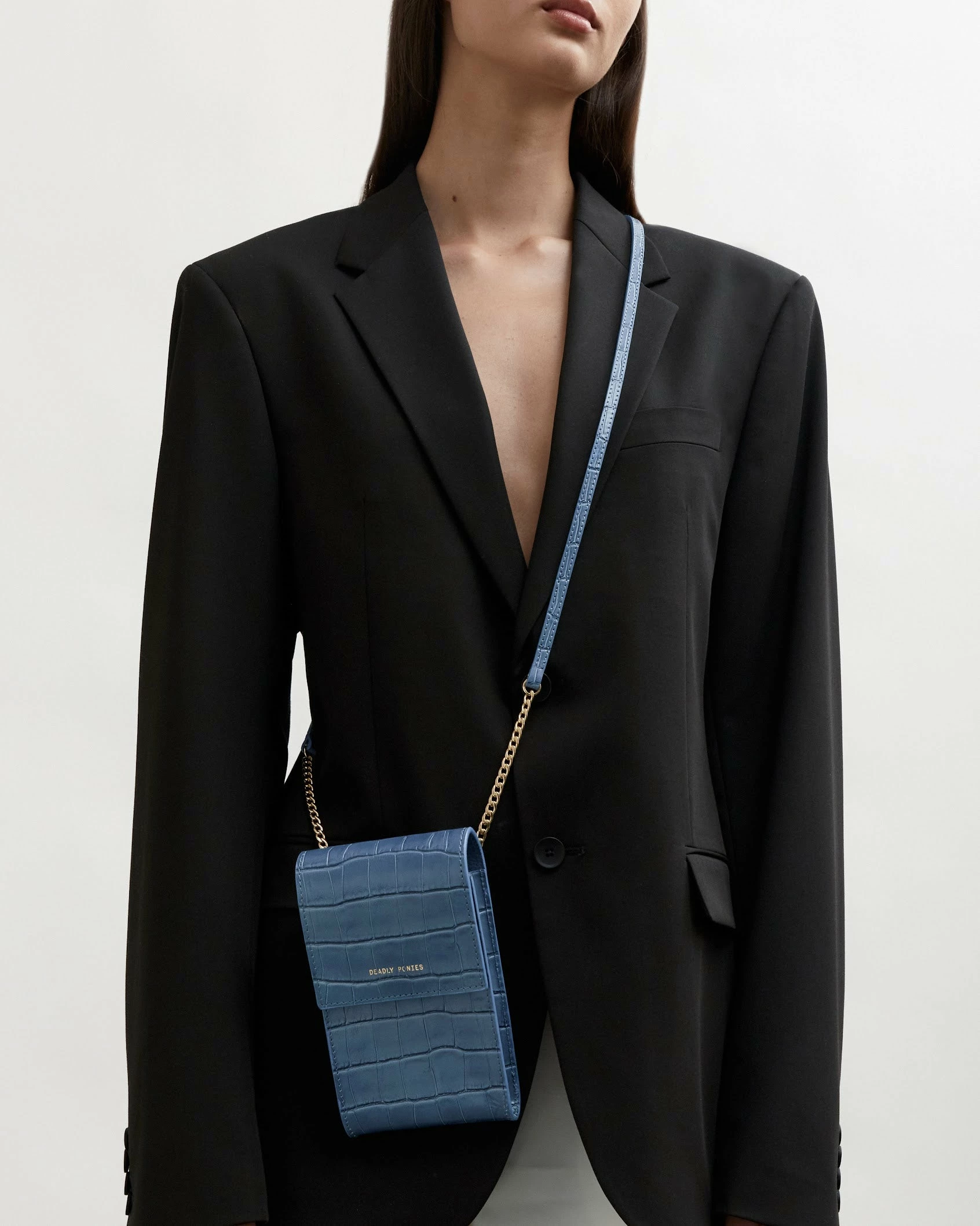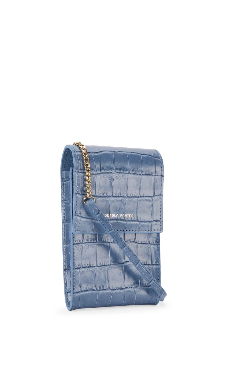 The Deadly Ponies Poucheroo Croc in Denim is a timeless favourite with a new spin. The highly coveted Poucheroo is the ultimate plus one, thanks to its ability to hold not only your phone but multiple cards and cash as well. This season sees Poucheroo level up with a fold-over magnetic closure, while his leather strap with brass chain extension ensures wearability for any occasion. Featuring two internal card slots, and an interior slip pocket, your belongings are always secure close to hand. Handcrafted in croc-embossed Bovine leather, he’s a luxurious gift for a loved one – or your lovely self.