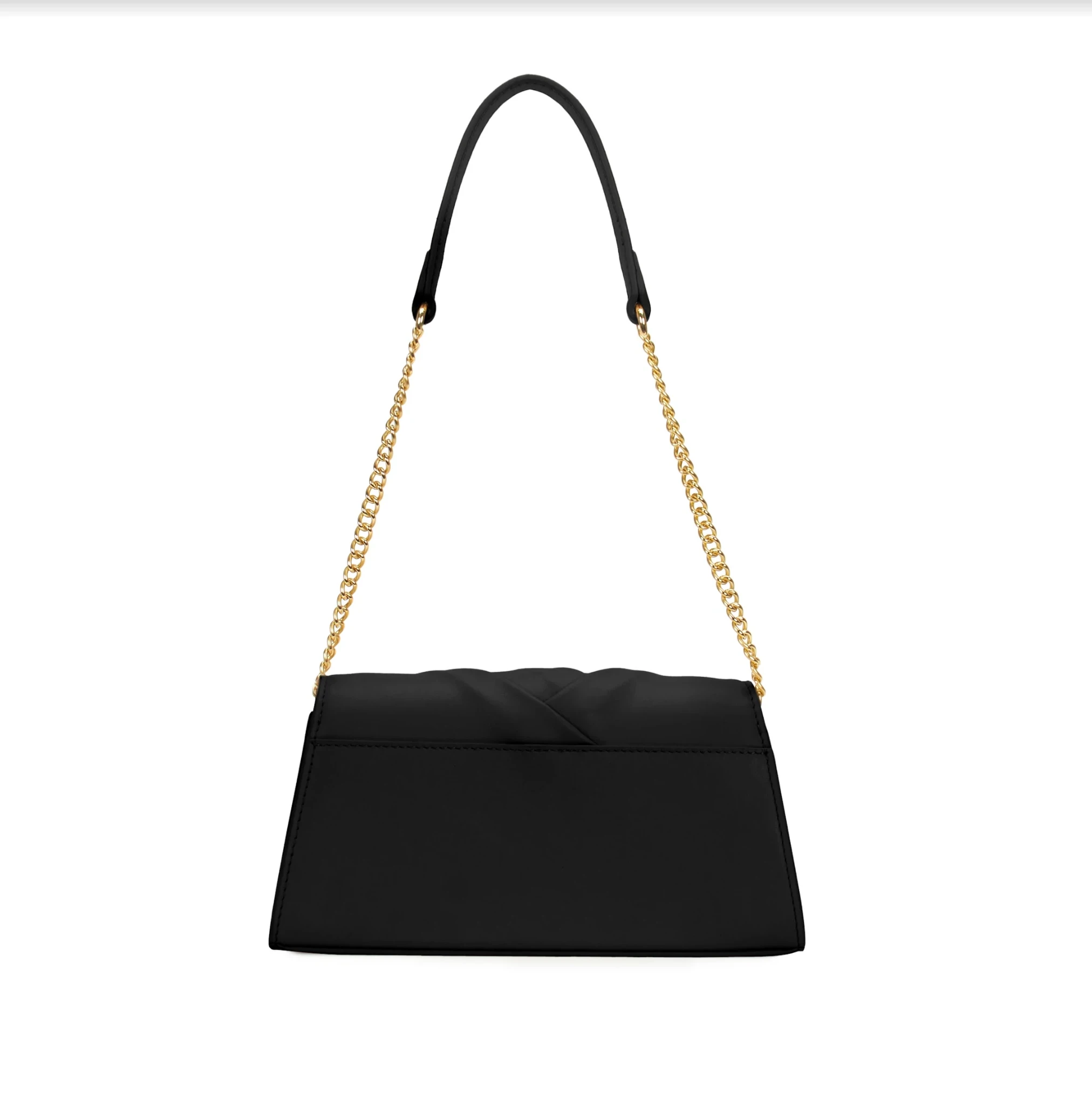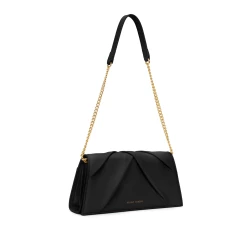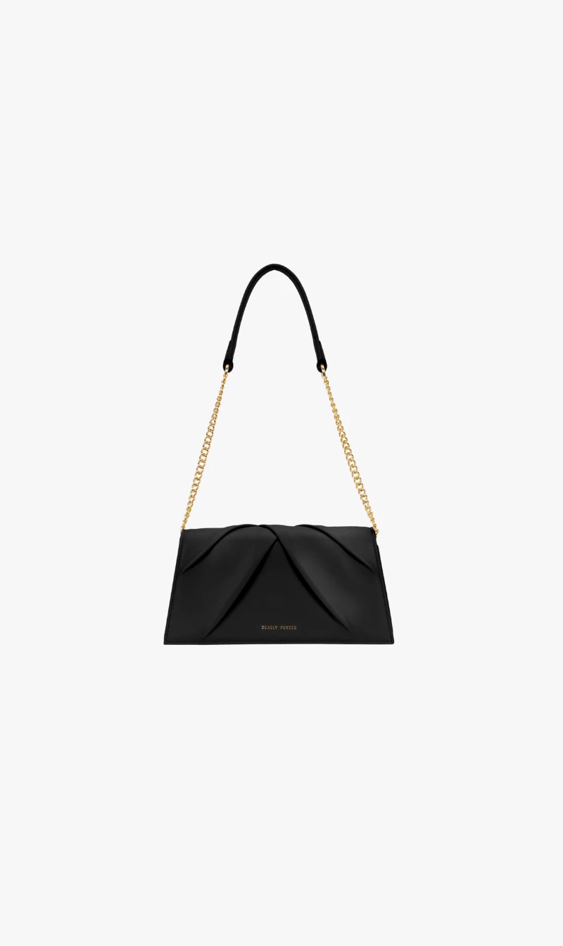The Deadly Ponies Ripple Mini in Black. Slimline, with folded-pleat detailing, the Ripple Mini is set to be your coolest companion. Either carry him in hand as a clutch or wear him crossbody for evenings on-the-go, thanks to a new detachable brass chain strap with leather shoulder pad. Whilst he is small in stature, this seasons Ripple Mini has had a slight increase to his size, holding two card slots plus an internal slip pocket and zip pocket for keeping your must-have essentials close to hand.