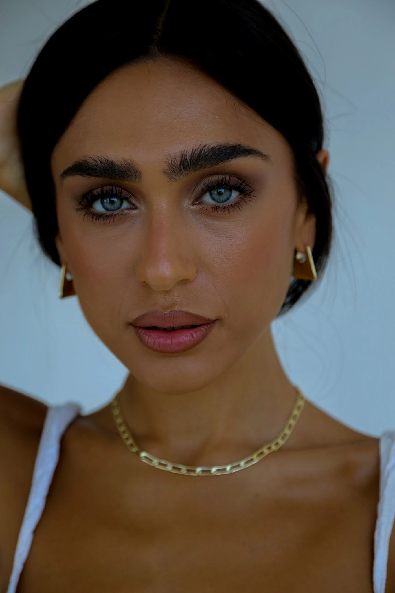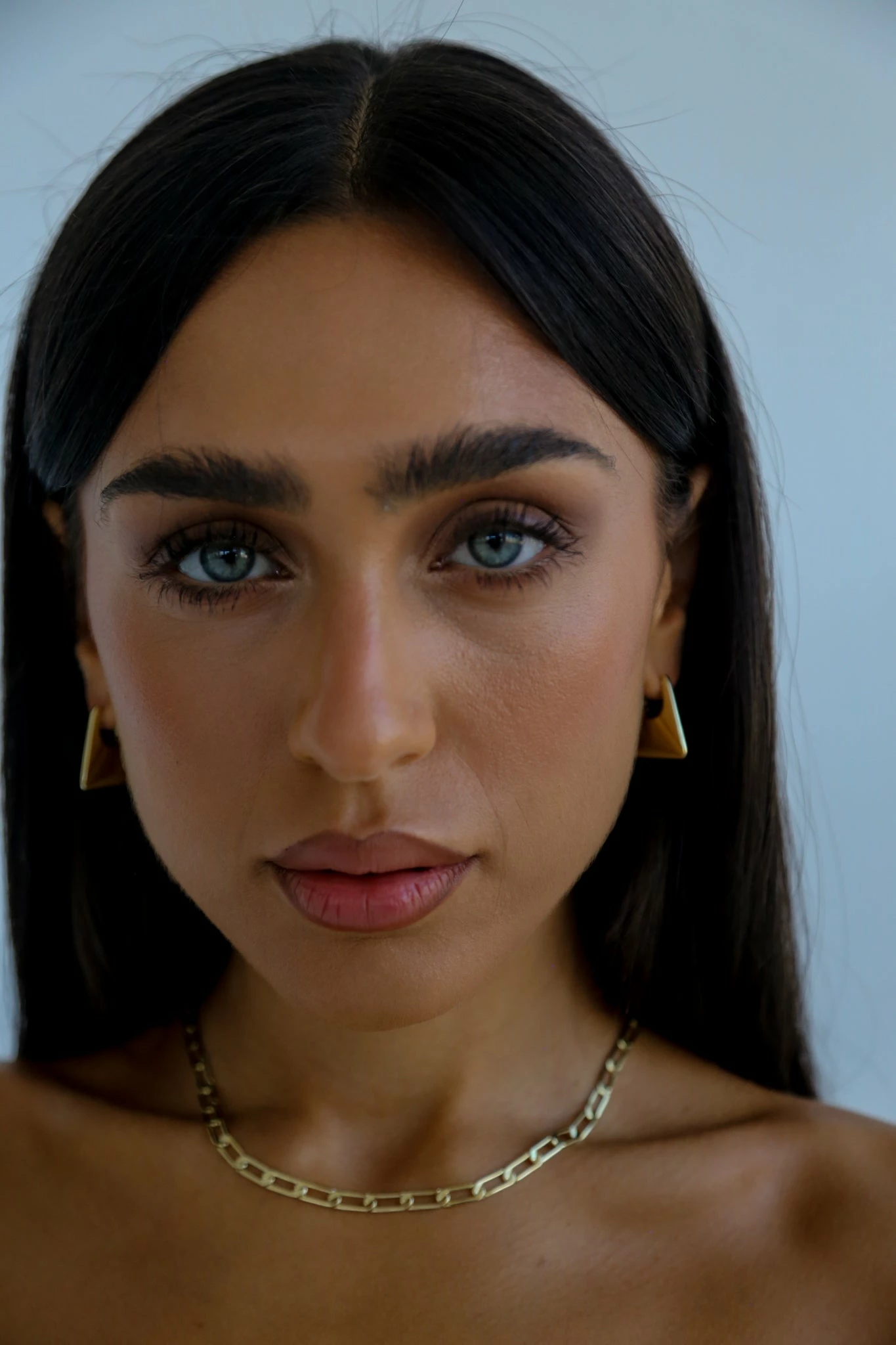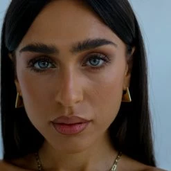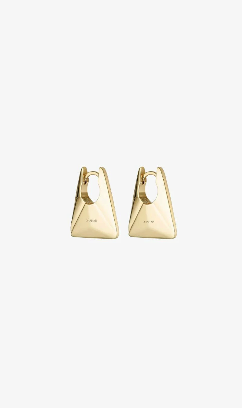 The perfect earring to add to your ear stack. The Amelia Earrings by Dhahab feature a dramatic triangular design, engraved with our logo. Our modern update to a classic hoop earring. For those who are wanting something a little different, these are it.