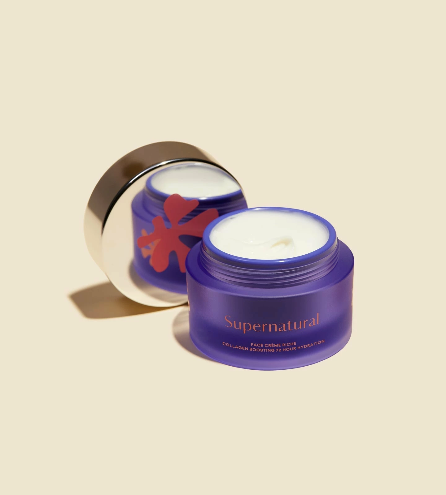 100% natural, Emma Lewisham’s Supernatural 72-hour Crème Riche contains high performing active ingredients for full-spectrum performance in helping regenerate collagen, deeply hydrating skin and delivering an ultra-radiant, youthful complexion.Â