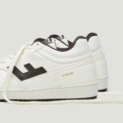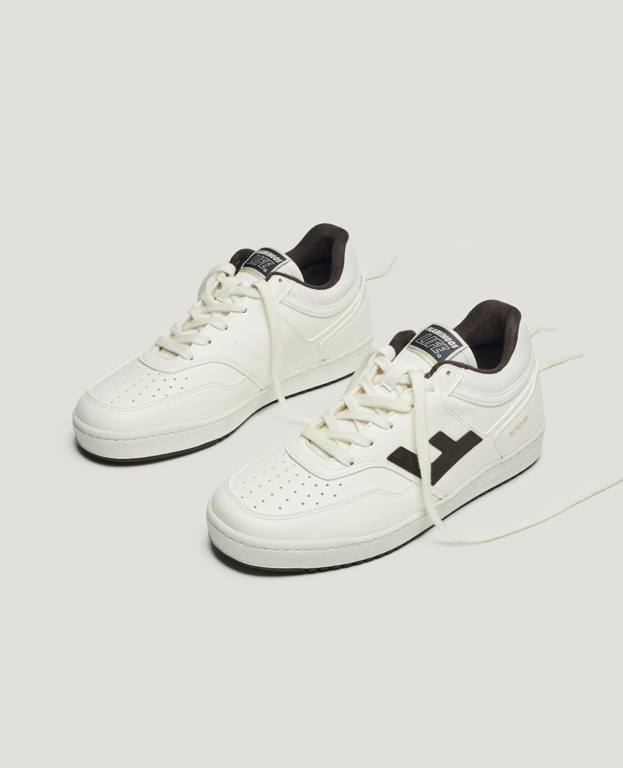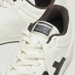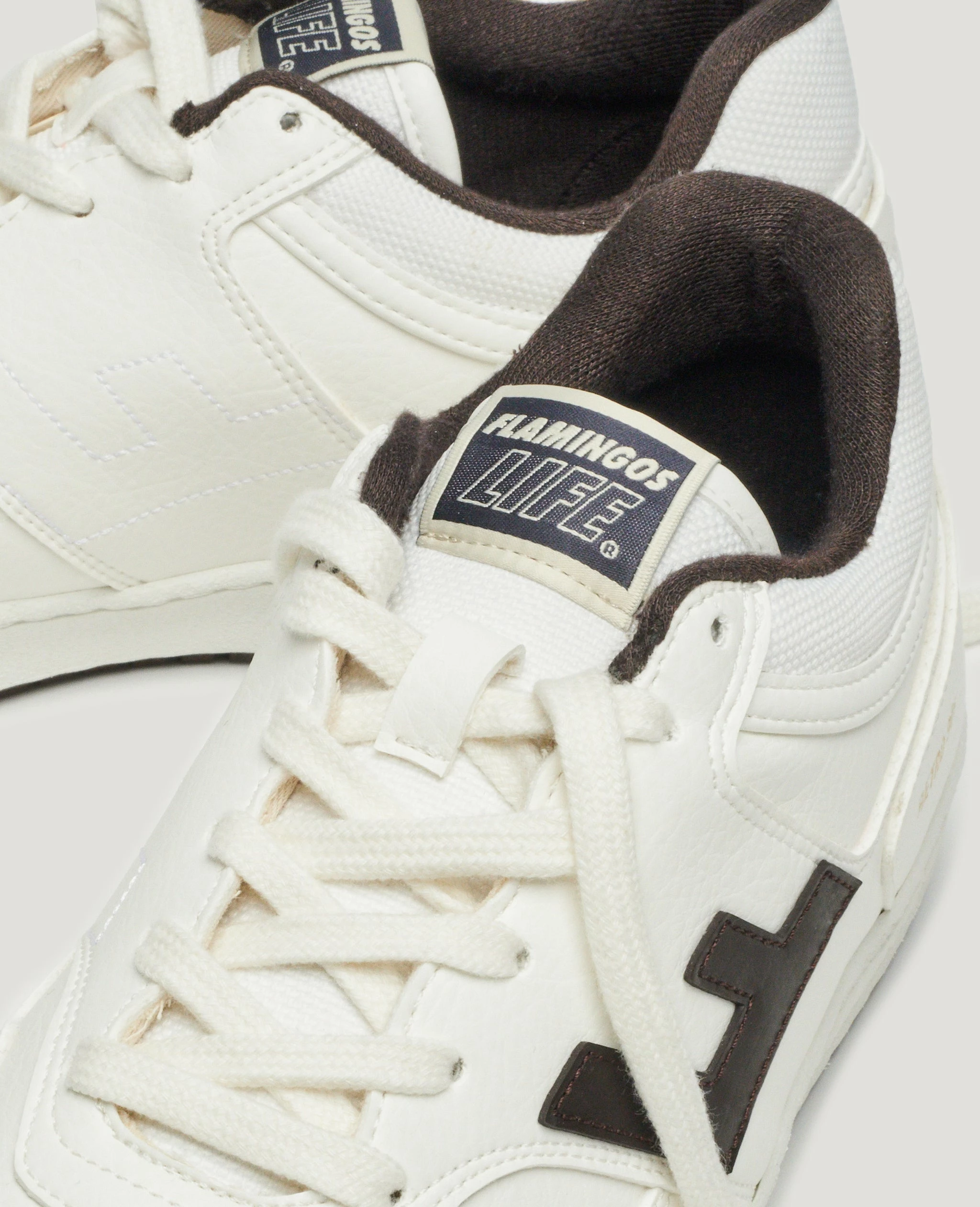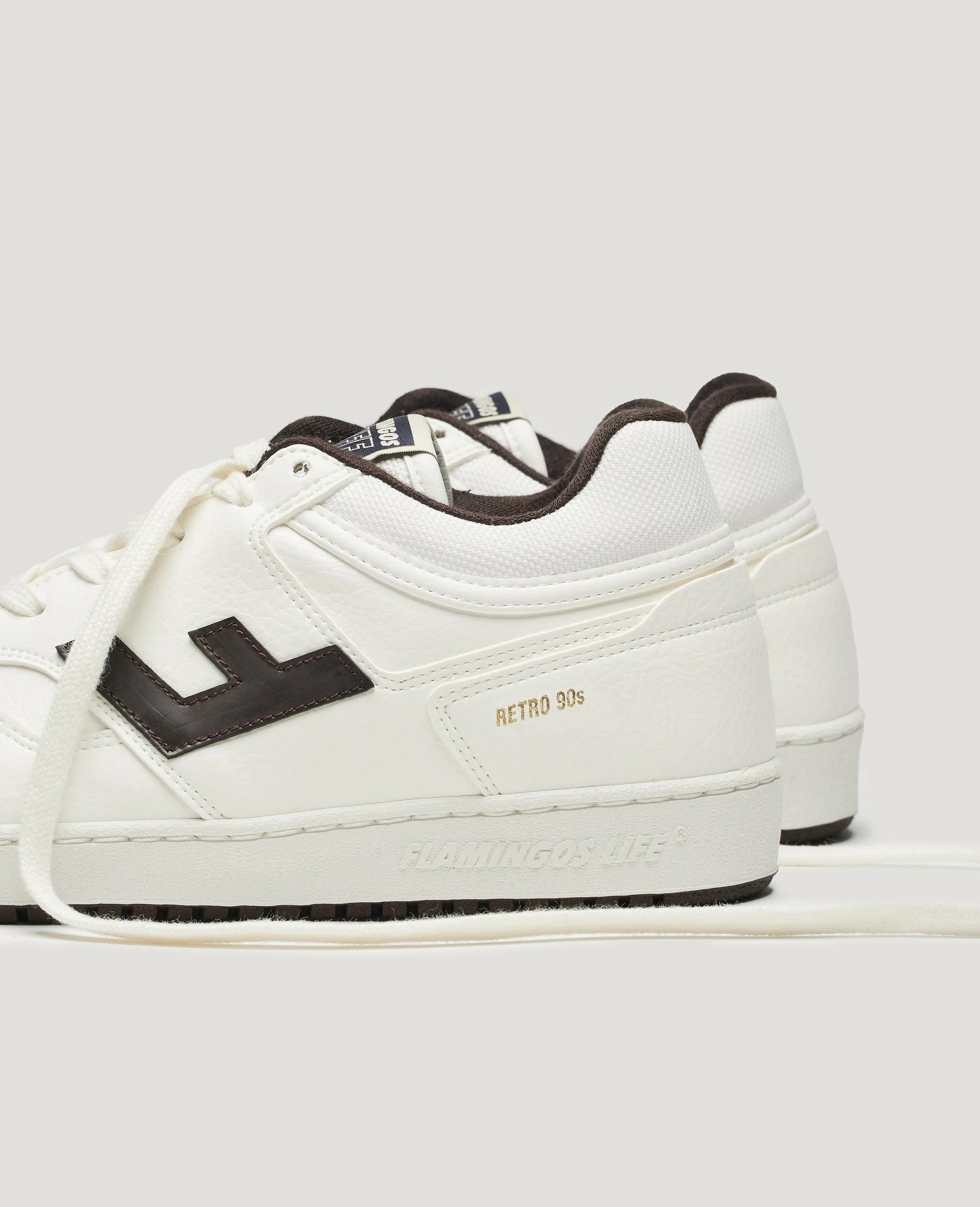 The Retro 90s Sneaker in Cocoa by Flamingos Life are in a white and brown colourway and crafted from 100% vegan materials. Style the Retro 90 Sneaker with denim jeans and a white shirt.