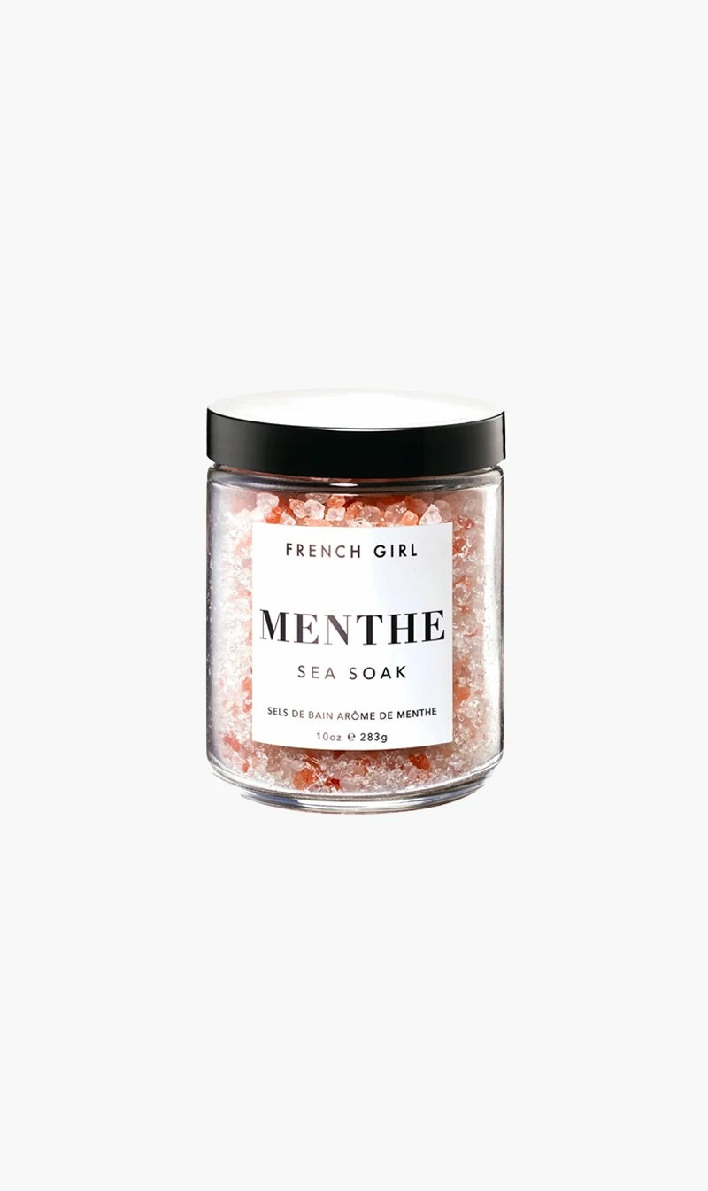 Relax and unwind in the soothing waters of the luxurious French Girl Menthe Sea bath soak made with 6 salt varieties infused with the refreshing scent of mint and rosemary to soothe aching muscles, soften skin, and ease the mind, body, and spirit