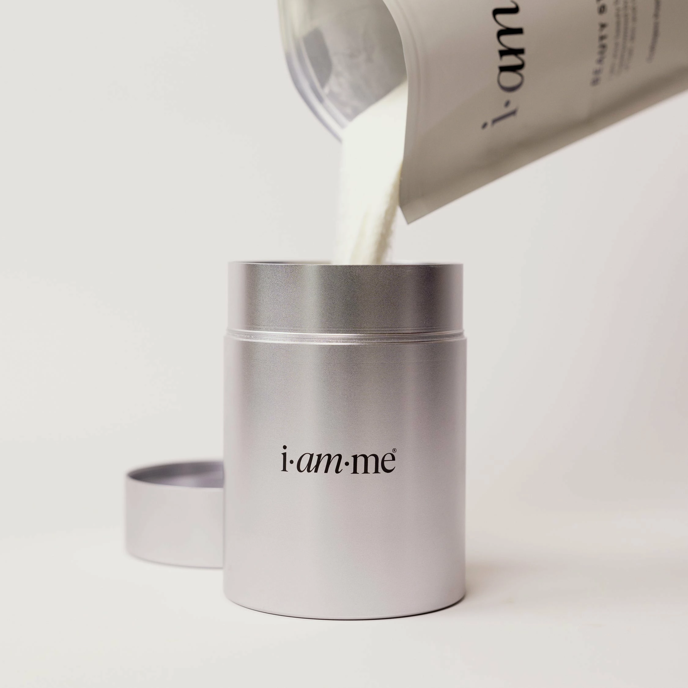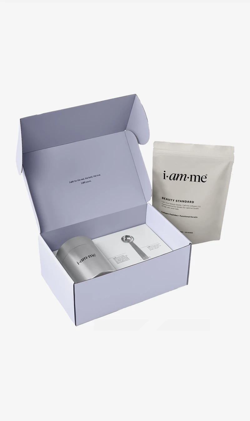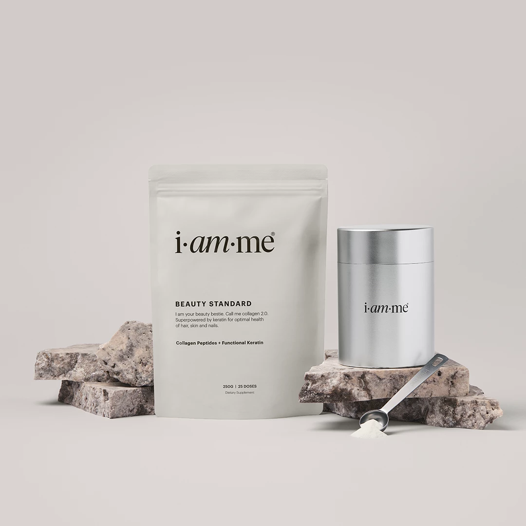 The i.am.me Beauty Standard Starter Kit. Is a scientifically formulated supplement with premium, high potency, odourless marine collagen. Powered by keratin to give support to your hair, skin and nails, leaving you glowing and feeling gorgeous.Â