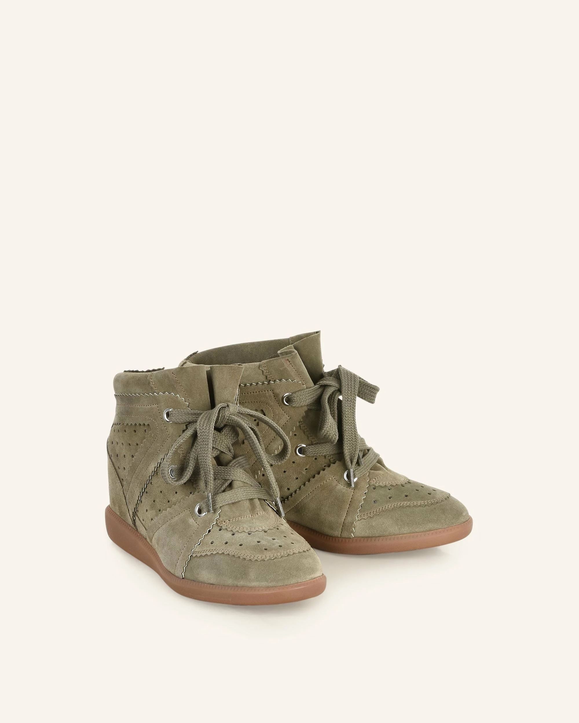 A true Isabel Marant icon, the Bobby Sneaker in Taupe is the ultimate in go-to footwear. With concealed heel and lace up front, these sneakers look amazing with any look. Paired back with denim, the Bobby offers an effortless street look. Or pair with a floaty dress and a blazer for something a bit more seirous. Either way – these are a wardrobe staple.Â
