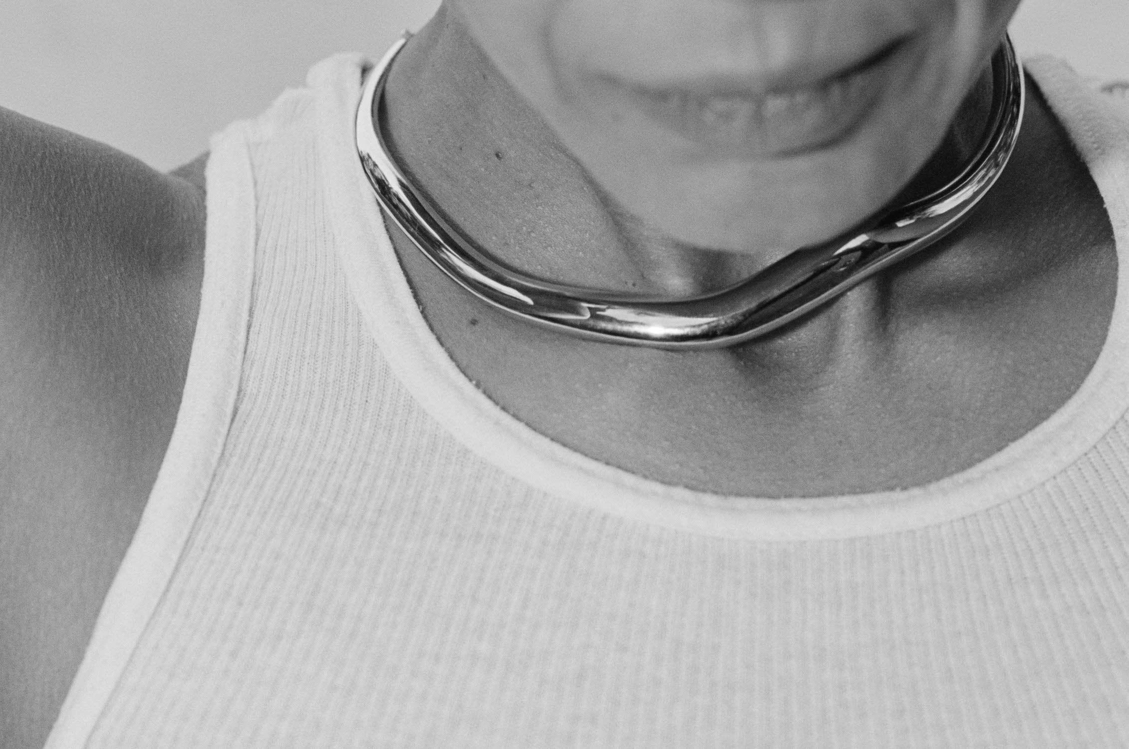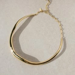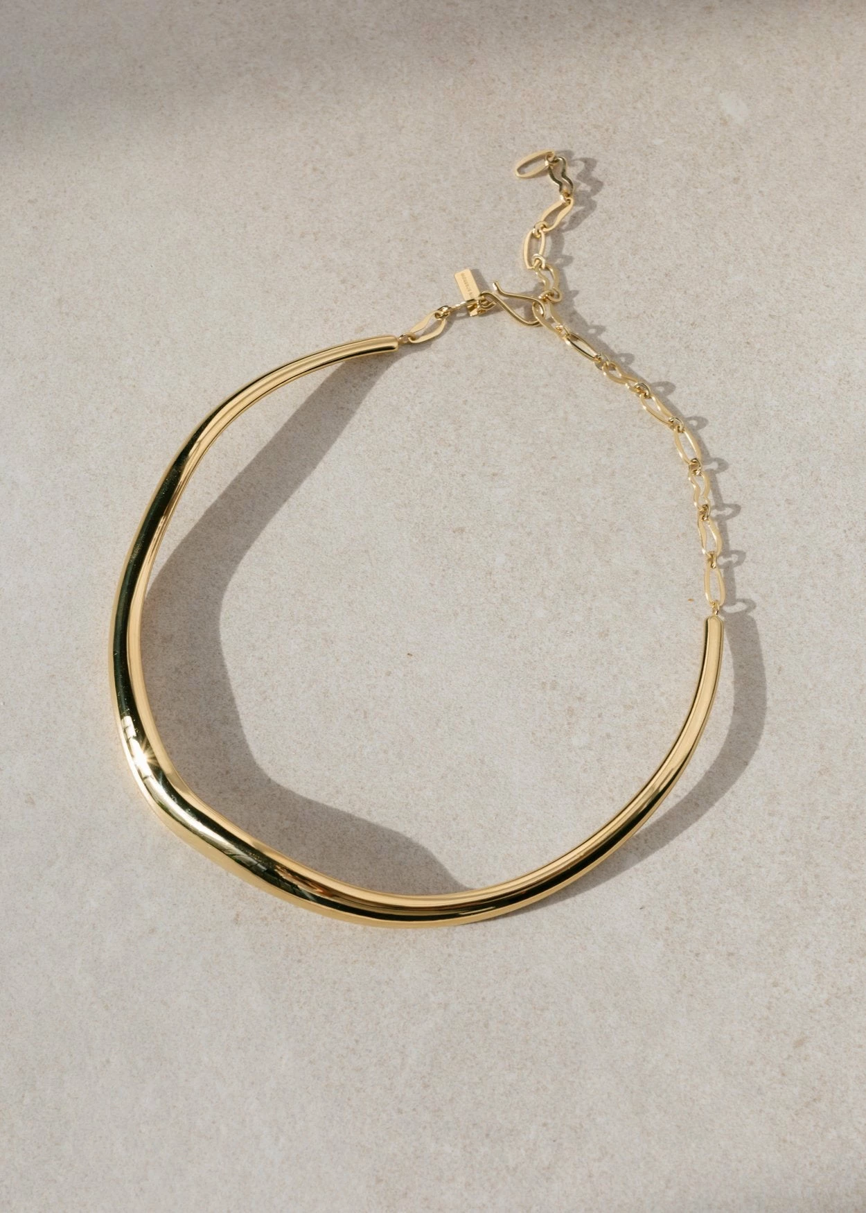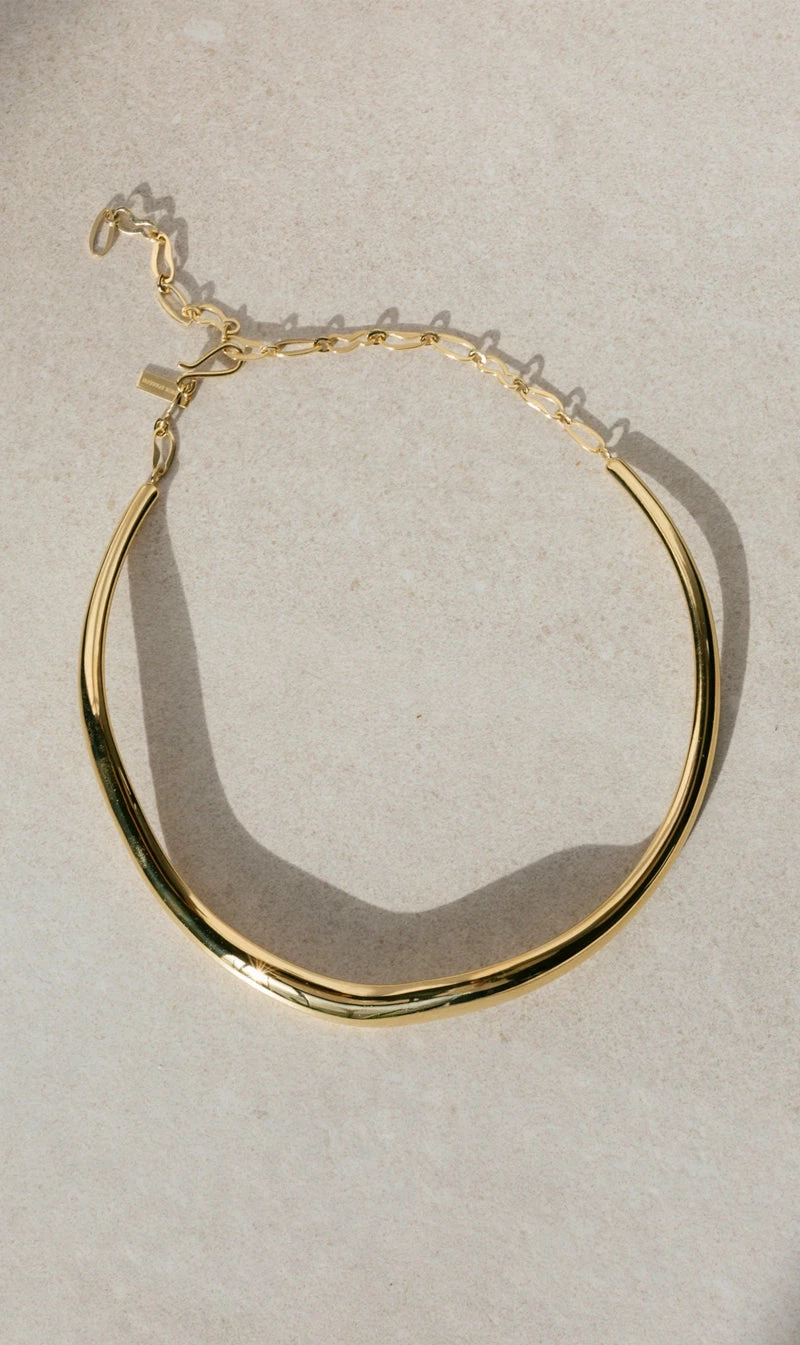 The Jasmin Sparrow Marea collar in Gold softly encases the neck with irregular metal contours. Fastening with a petite take on their signature Coco chain, this piece has a hook closure for adjustable positioning atop of the collarbone.