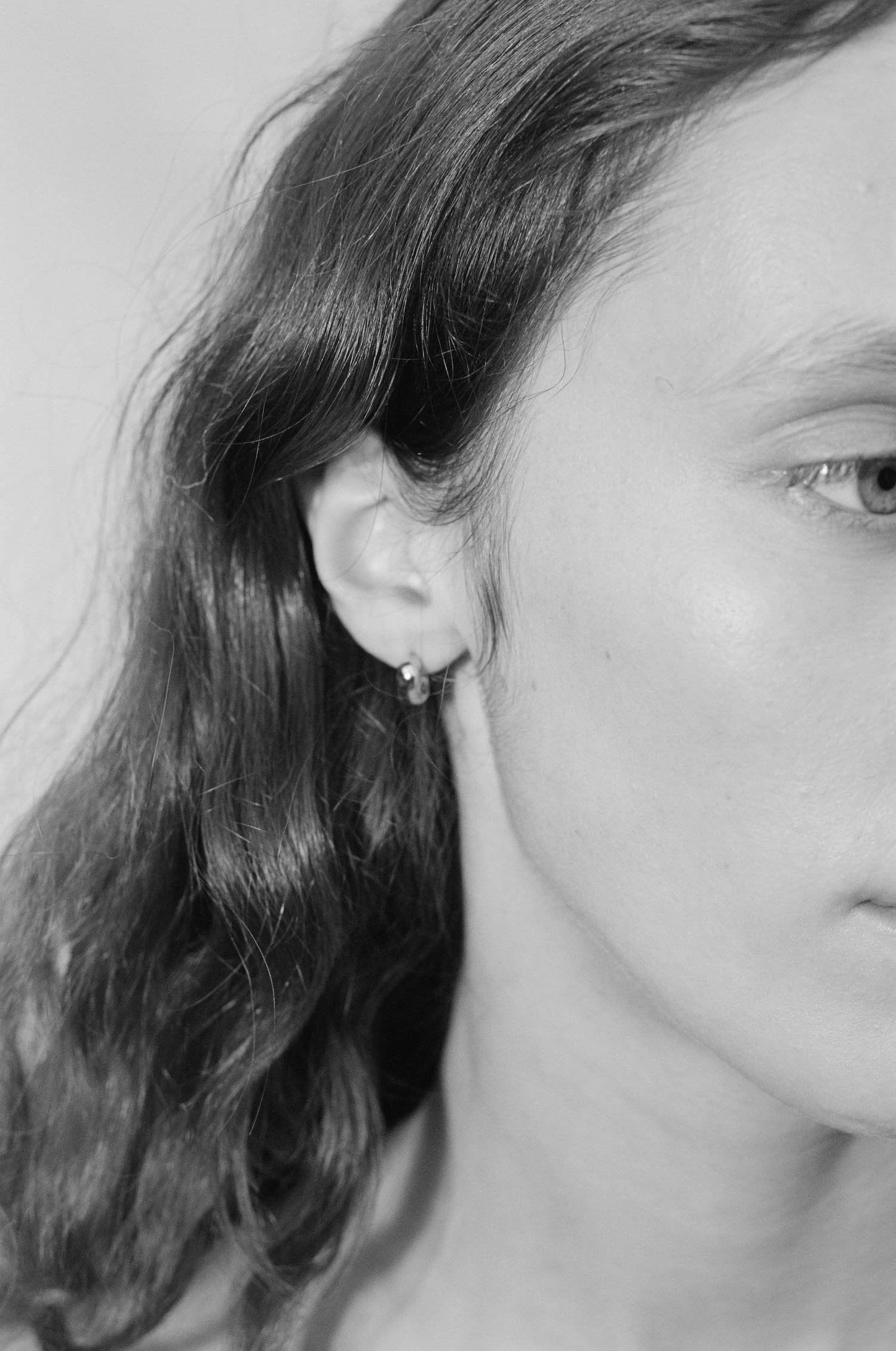 A subtle finishing touch, the Jasmin Sparrow small Marea hoops in Silver mimic the natural curves of the body. Gently hugging the earlobe in a sculptural metal form with irregular contours.Â
