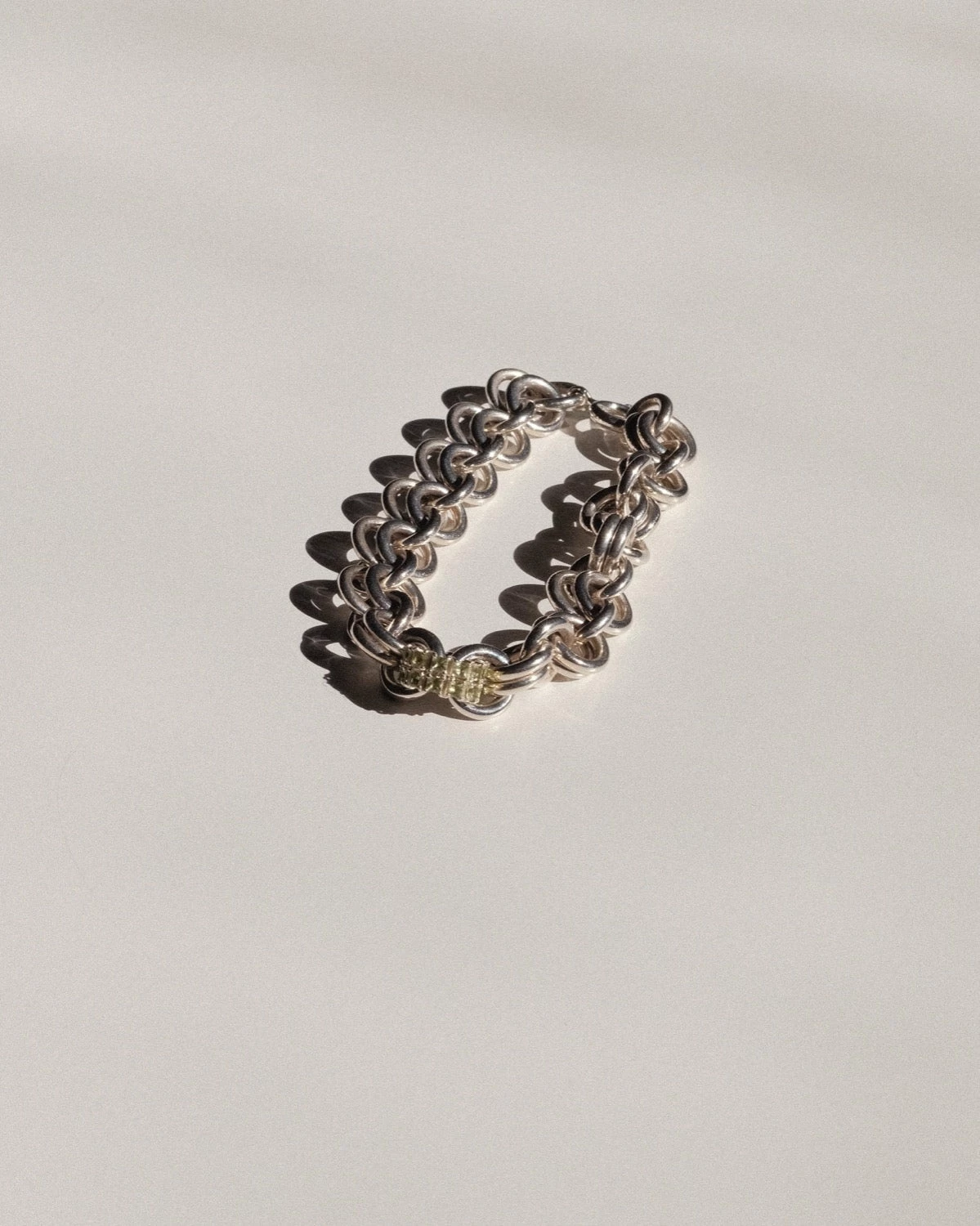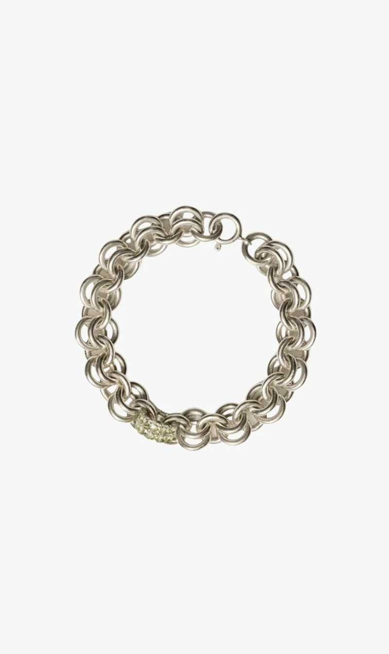 Forging a sense of strength through delicacy, the Martine Bracelet from Jasmin Sparrow heroes themes of infinity and cyclic journeys. Capturing and reflecting light with a double, box set, Peridot link. Revered for fostering feelings of connection, Peridot gives Martine a luminous focus. Through a sophisticated three-link circular structure, the Martine story presents Sparrow’s masterful way of composing weight through intricate forms.