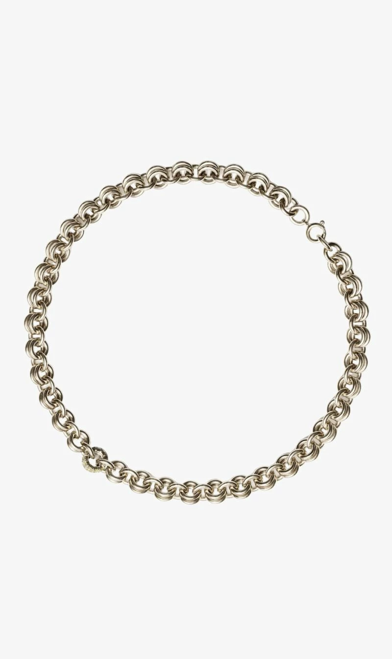 Forging a sense of strength through delicacy, the Jasmin Sparrow Martine Necklace heroes themes of infinity and cyclic journeys. Capturing and reflecting light with a double, box set, Peridot link. Revered for fostering feelings of connection, Peridot gives Martine a luminous focus. Through a sophisticated three-link circular structure, the Martine story presents Sparrow’s masterful way of composing weight through intricate forms. Poised to make a statement, wear Martine alone or artfully layered as you wish.
