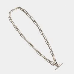 Elongated oval links encircle the neck, coming together with a toggle closure that accents the timeless quality of the piece. Toggle can be worn sitting at the back, or pulled through the loop at the front, elegantly falling down the neck.