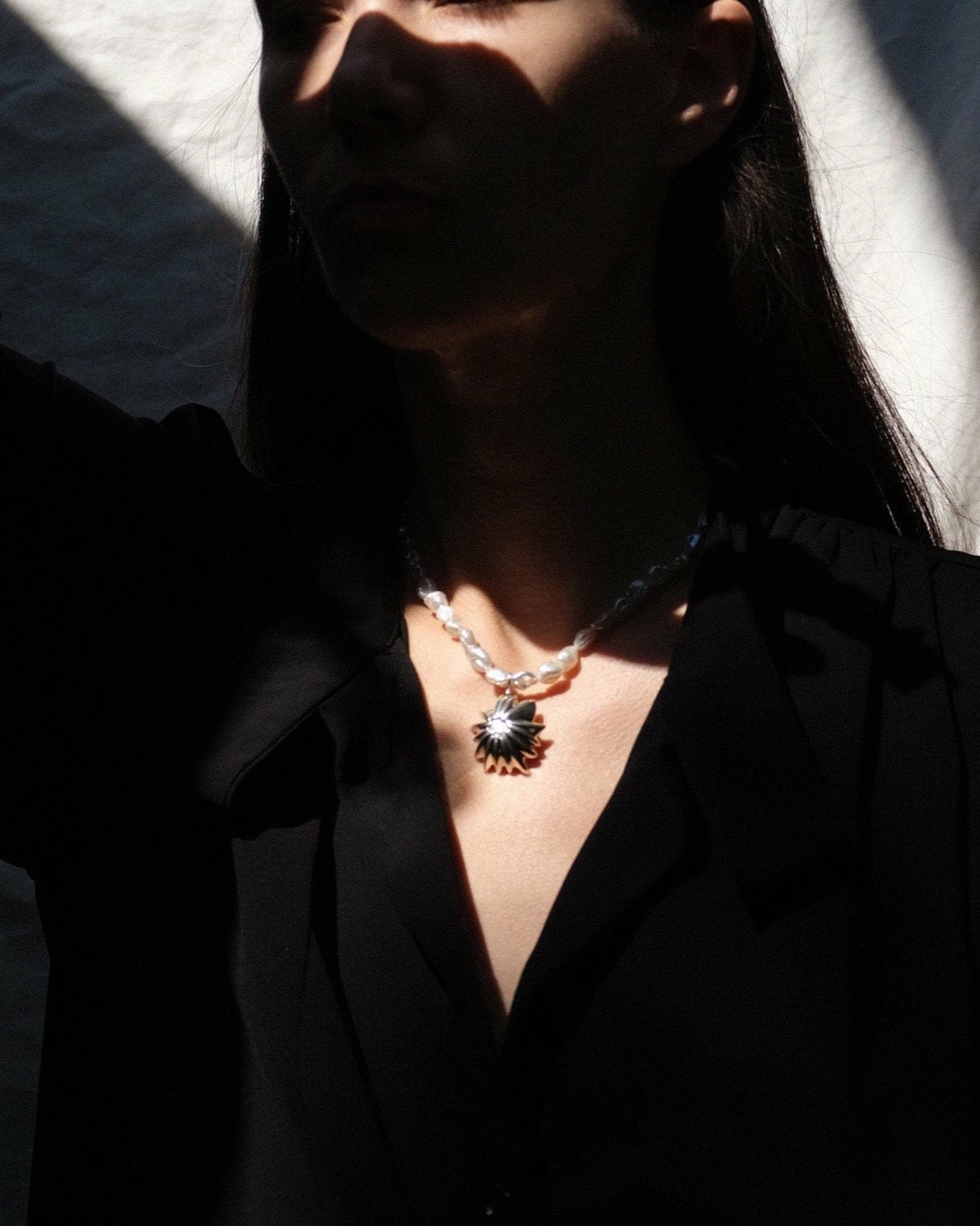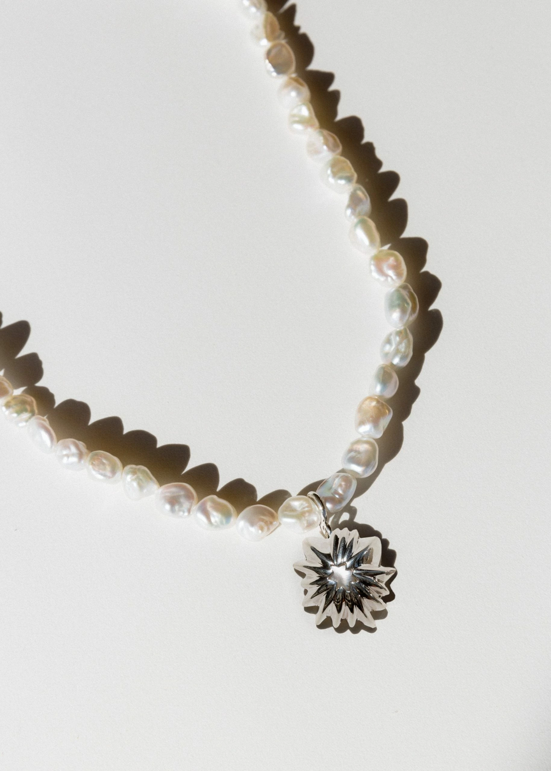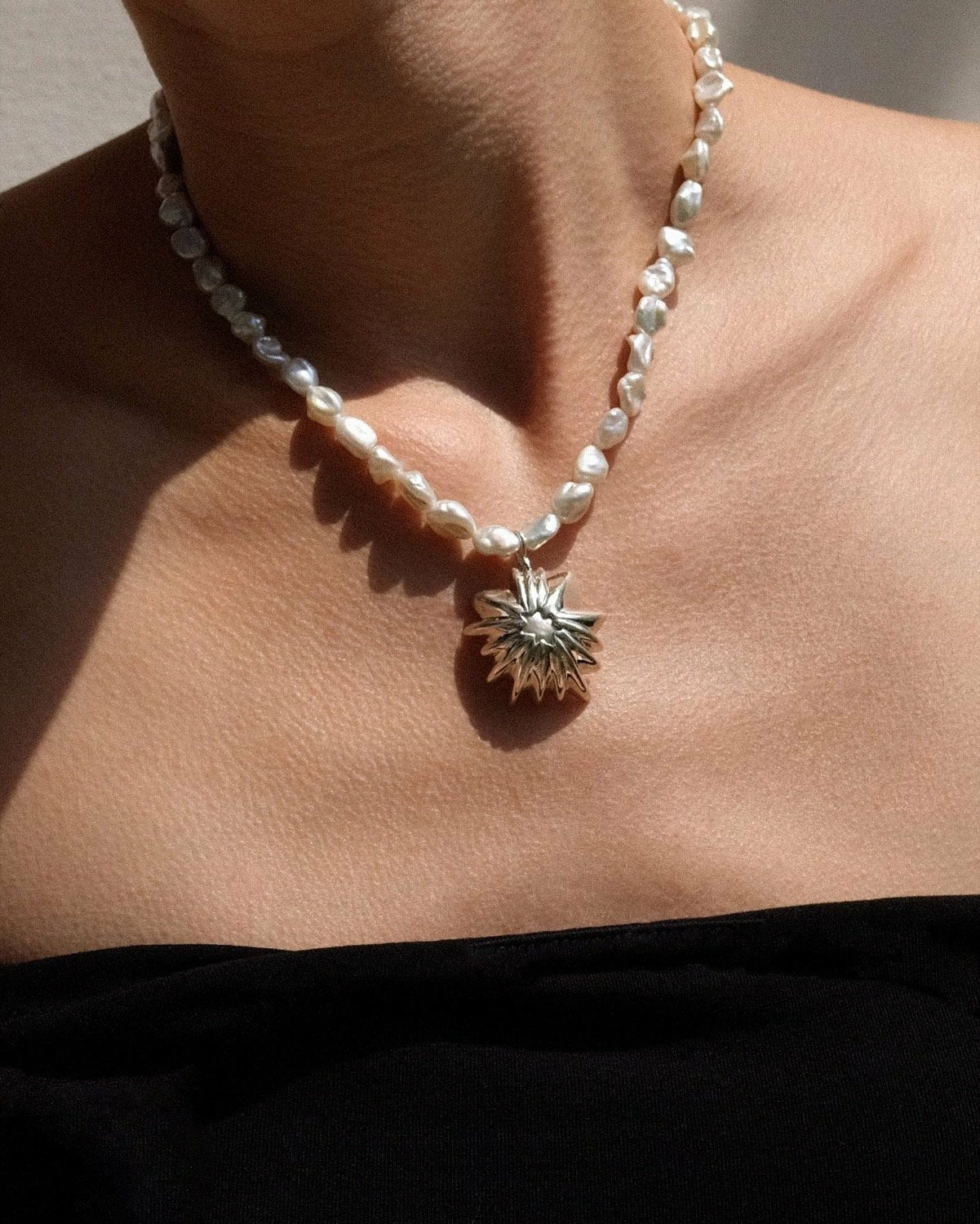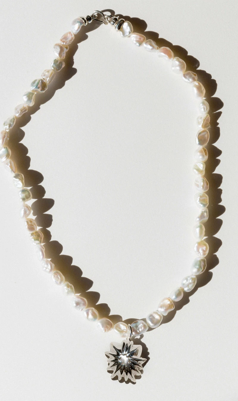 The Jasmin Sparrow Reine Necklace in Silver merges two of La Mer’s stories featuring a pendant of the same scale and setting as the Bernique Earring on a string of pearls.