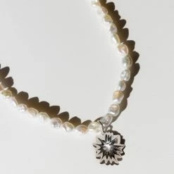 - Handcafted from recycled sterling silver and baroque pearls. Pearl chain length measures 40cm in length, pendant measures 3cm x 3cm.
