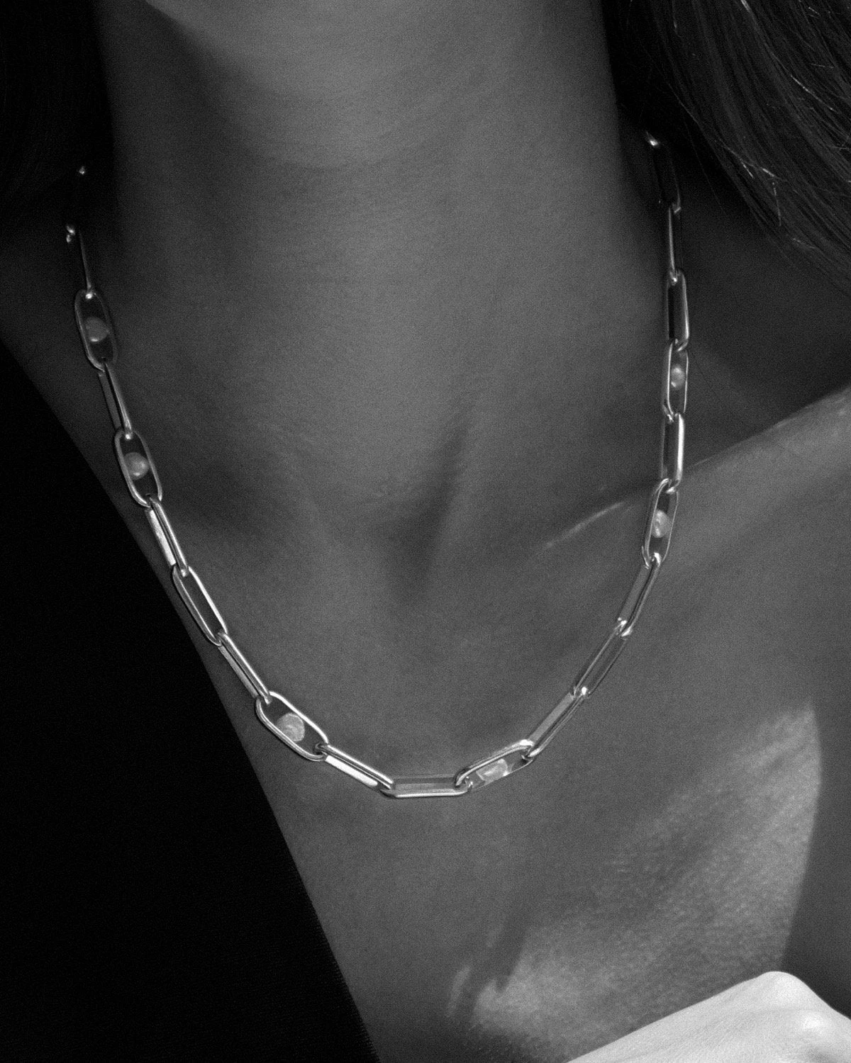 The Jasmin Sparrow Victorie Necklace in Gold. Elongated oval links encircle the neck, with organic sea pearls placed irregularly throughout the chain. Coming together with a toggle closure that accents the timeless quality of the piece. Toggle can be worn sitting at the back, or pulled through the loop at the front, elegantly falling down the neck.