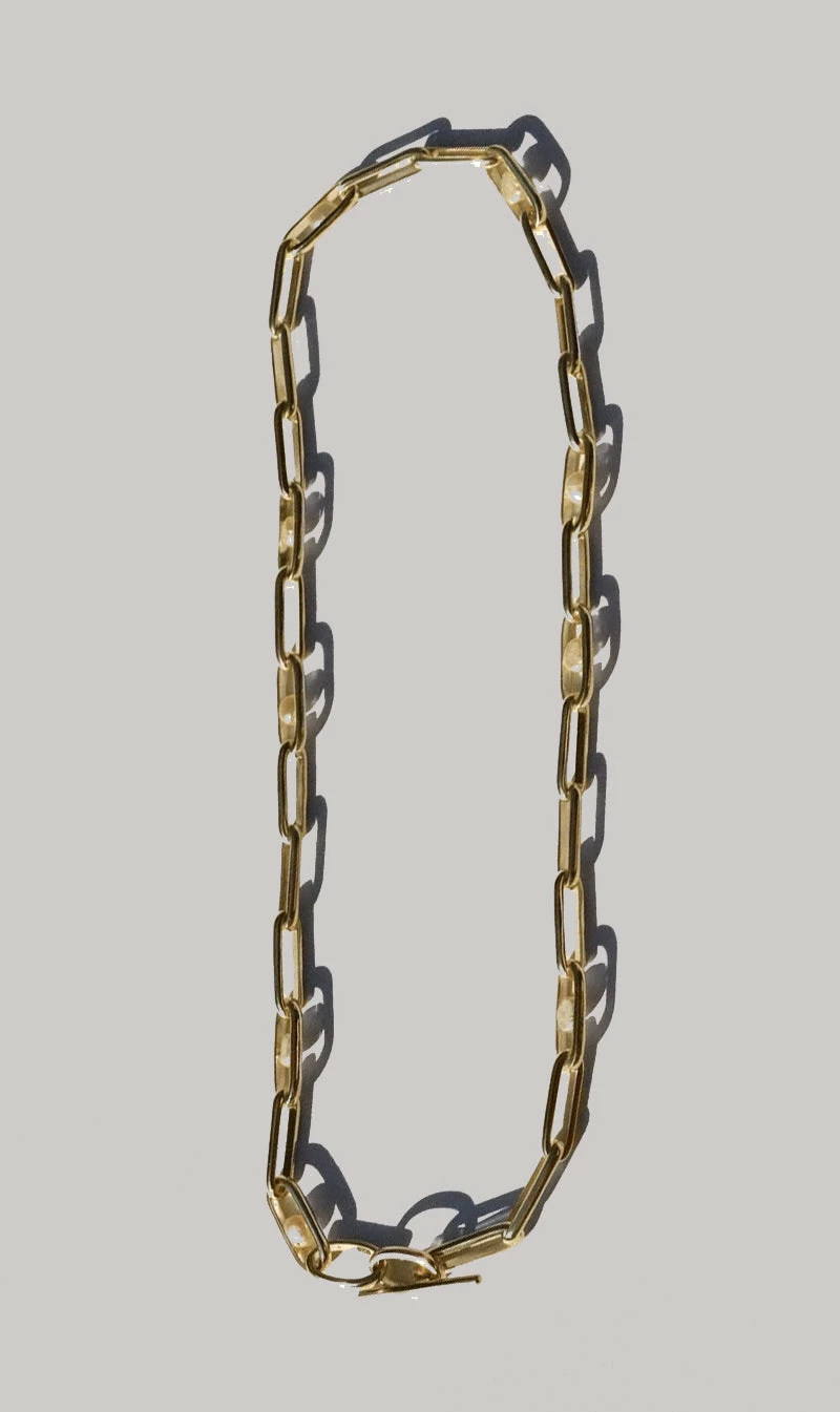 - Handcrafted from 18 carat gold plated recycled sterling silver. Each link measures 20mm by 5mm. Entire chain length 48cm.
