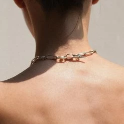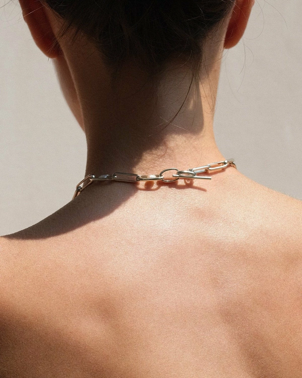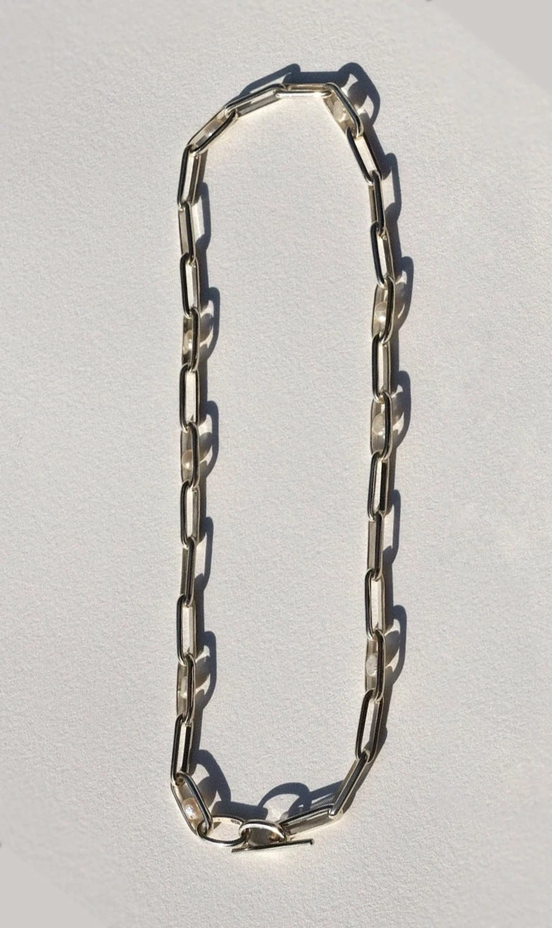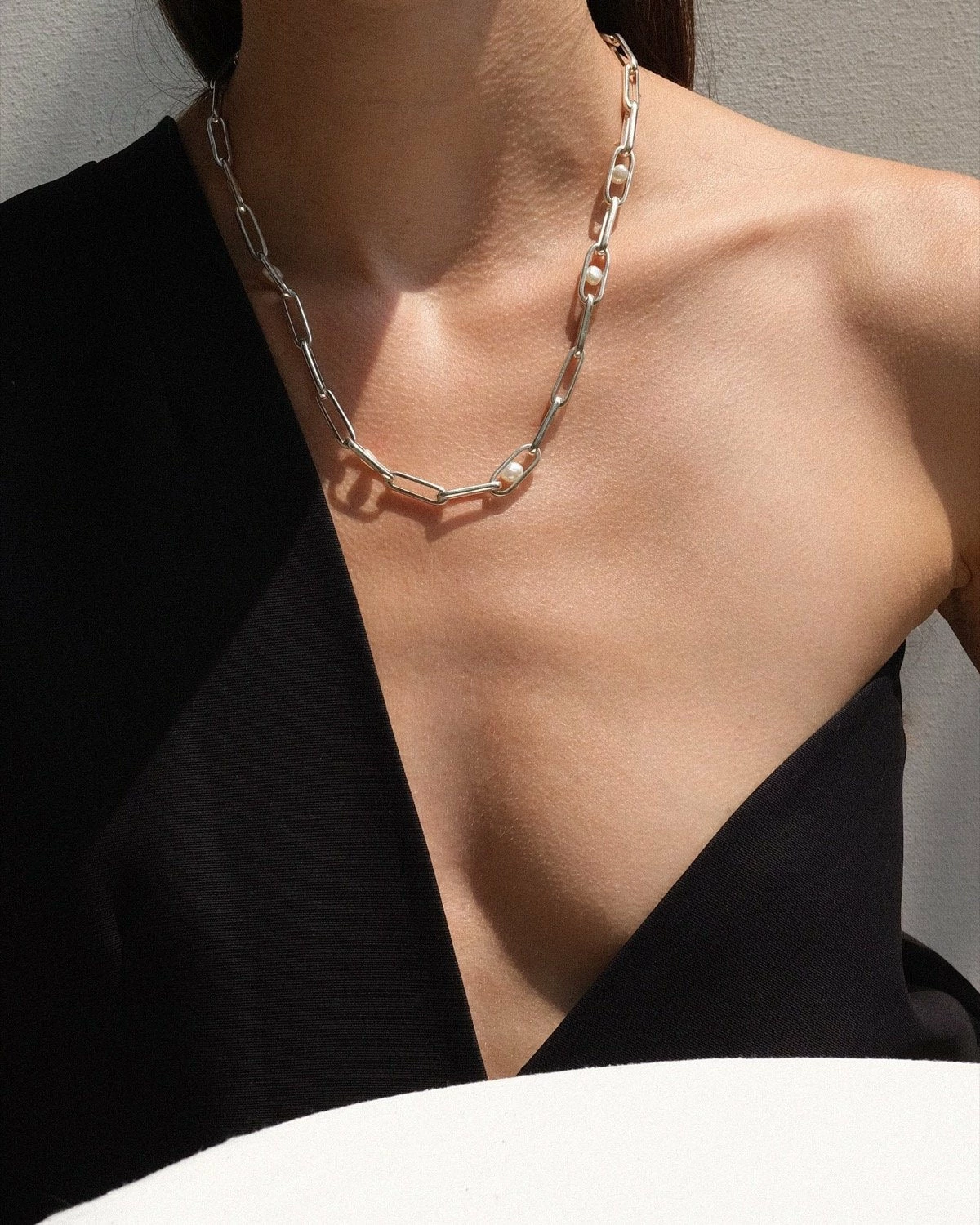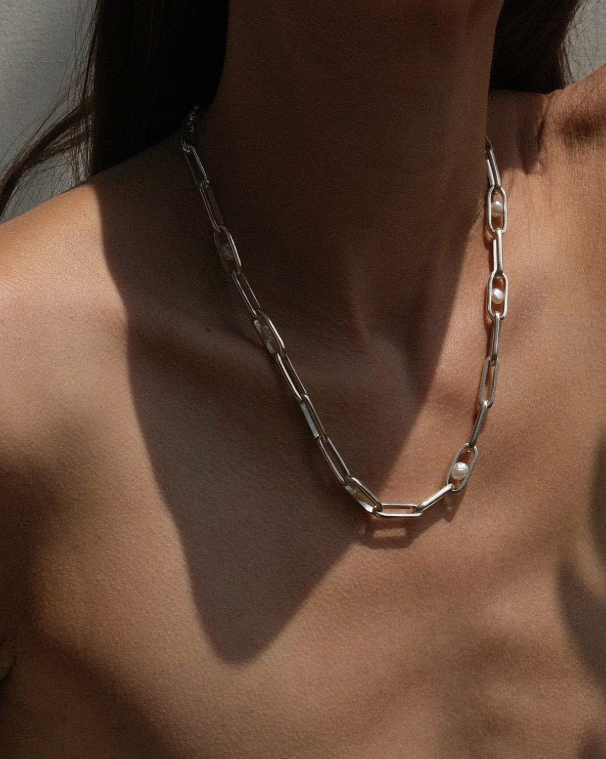 The Jasmin Sparrow Victorie Necklace in Silver. Elongated oval links encircle the neck, with organic sea pearls placed irregularly throughout the chain. Coming together with a toggle closure that accents the timeless quality of the piece. Toggle can be worn sitting at the back, or pulled through the loop at the front, elegantly falling down the neck.