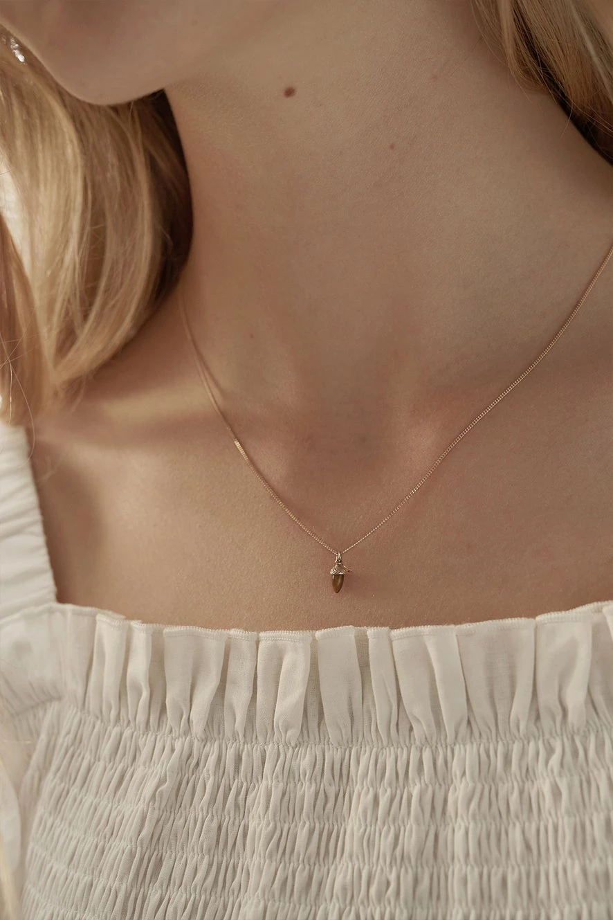 Returning to our iconic acorn, we have miniaturized its naturalistic design to a dainty wee pendant and where once the organic wooden nut sat, a gleaming tiger’s eye has budded in its place. Cast in 9 carat yellow gold and suspended from an elegant 45cm chain this little beauty flutters alongside its accompanying oak leaf.