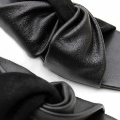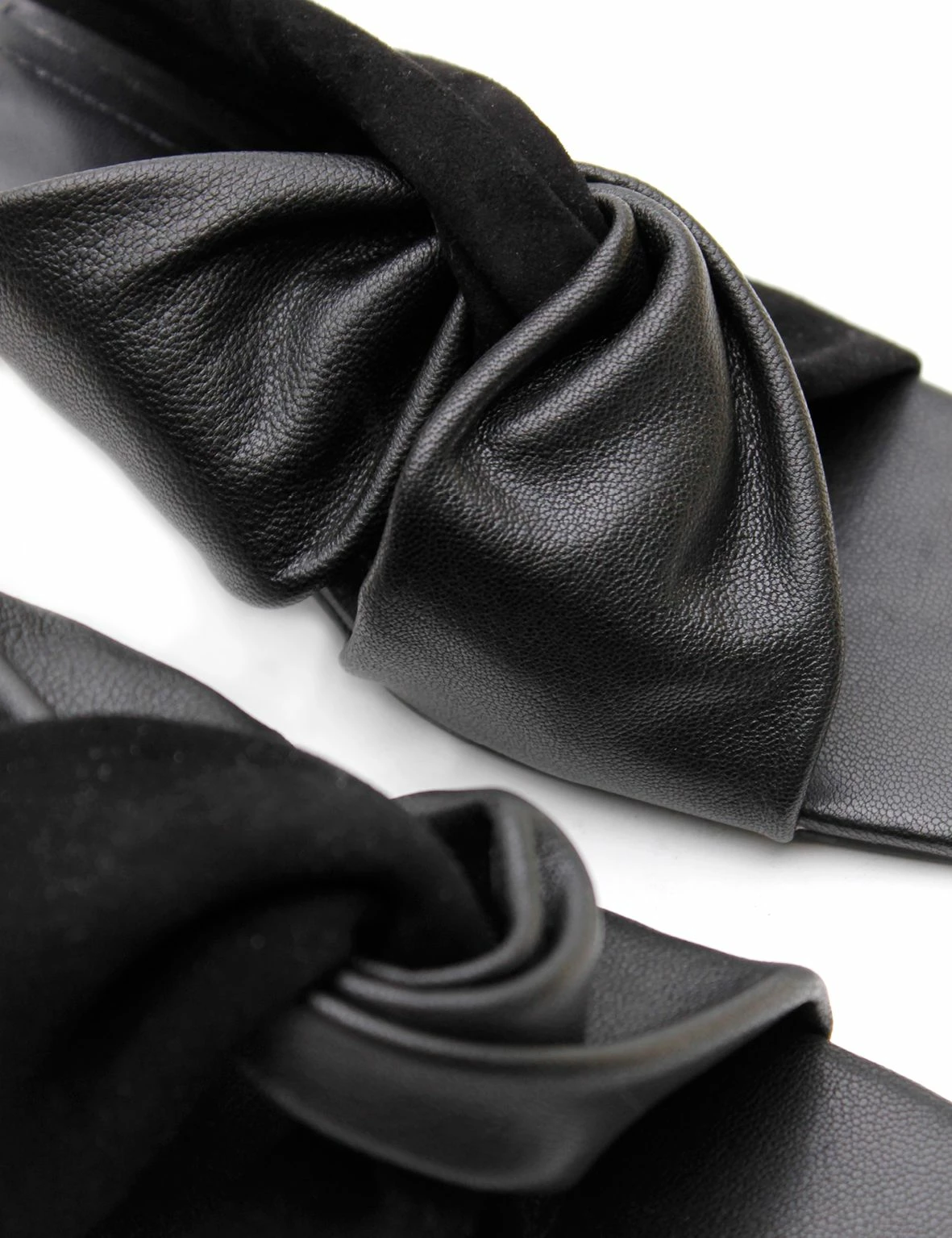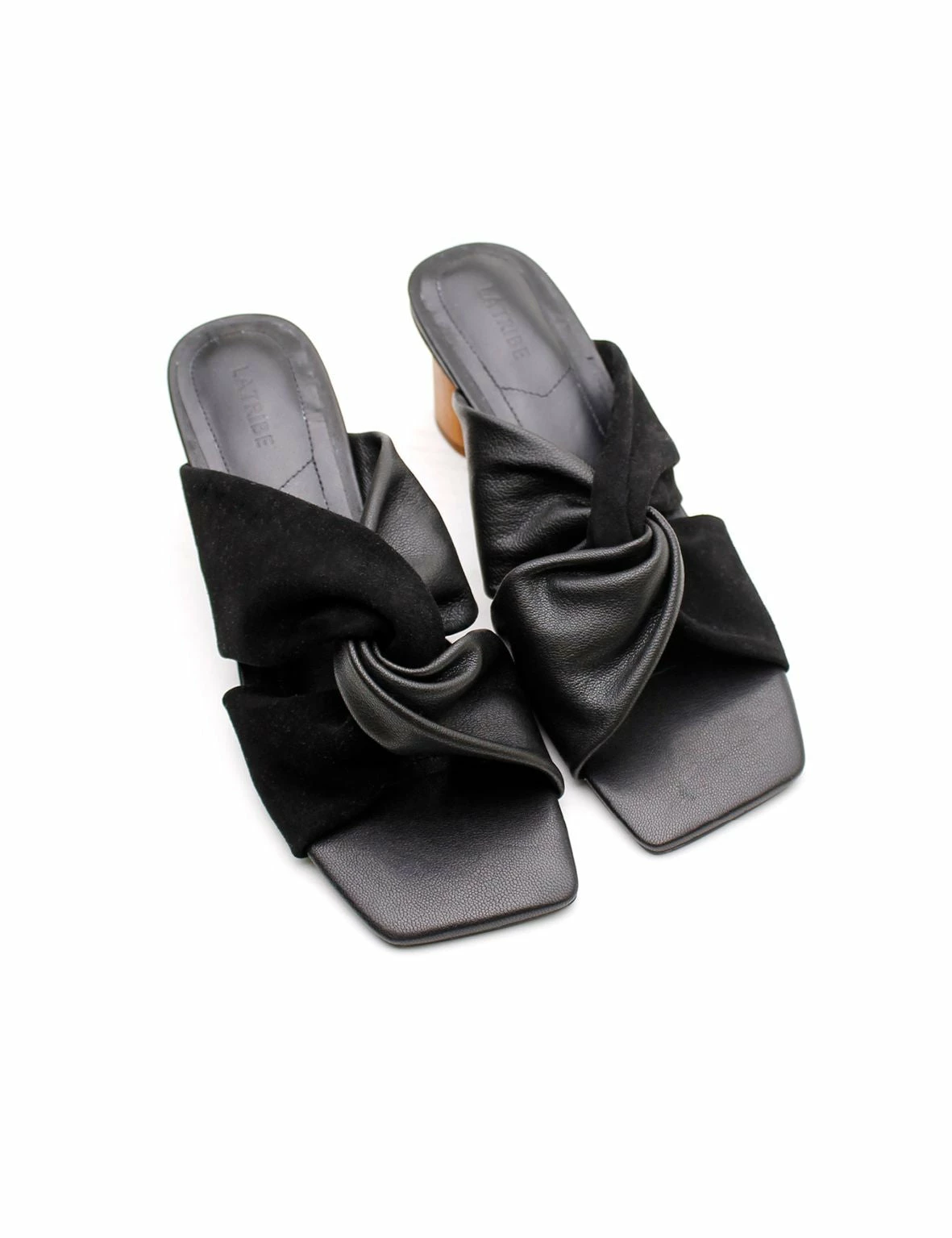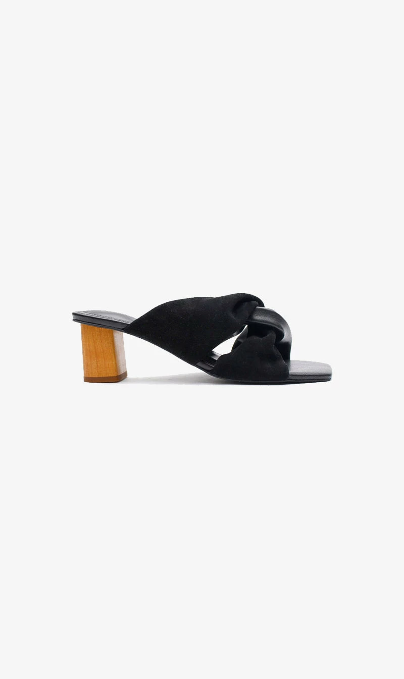 The La Tribe Twisted Mule Suede in Black features a contrast leather and suede strap twisted into a retro-inspired detail. A mid-height wooden heel makes for comfortable, everyday wear.