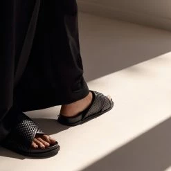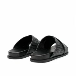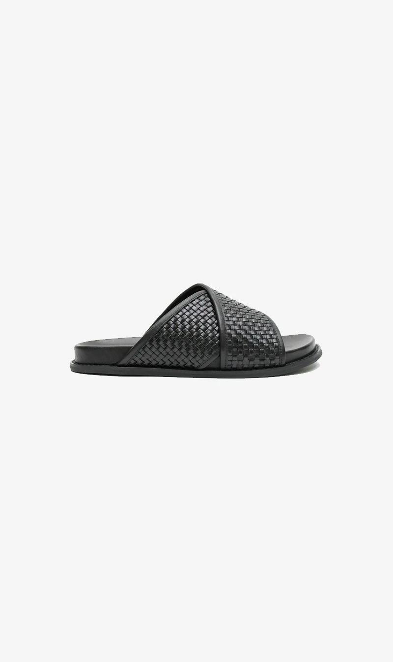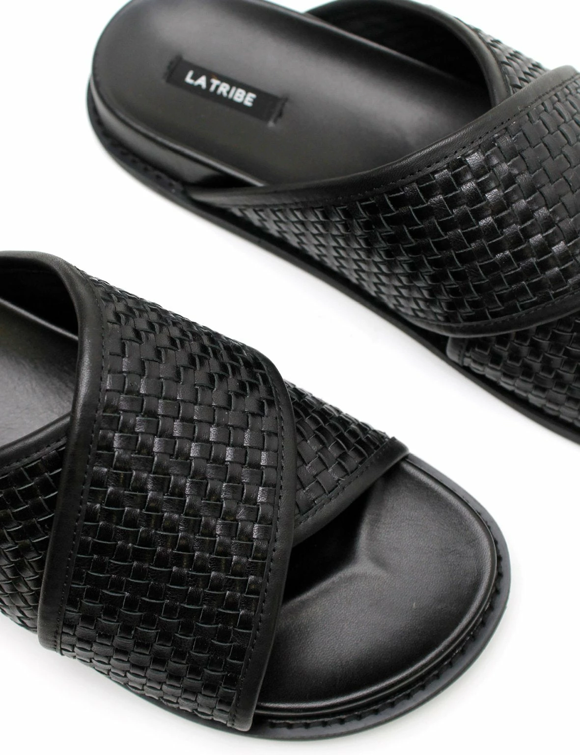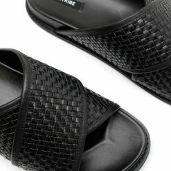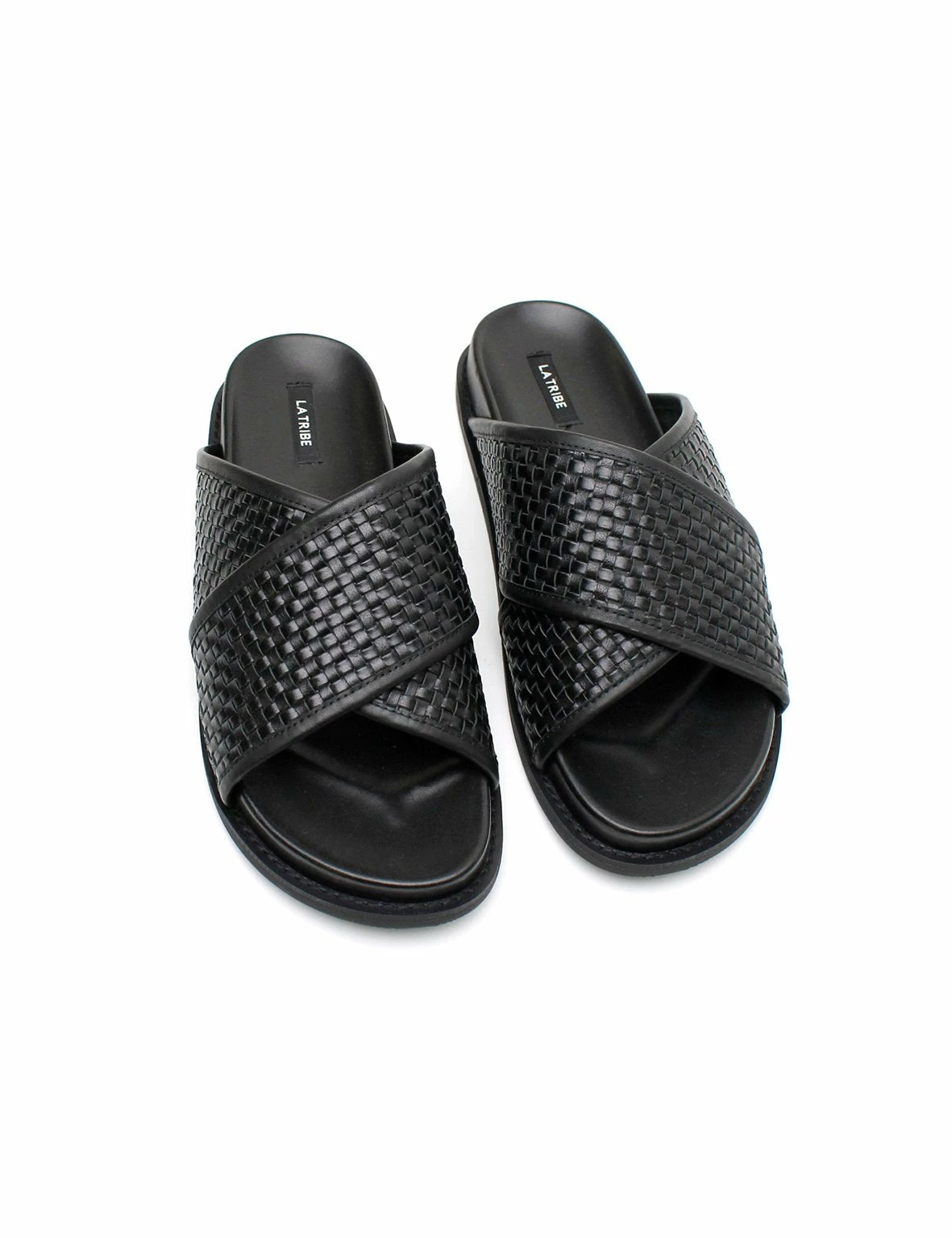 The La Tribe Woven Crossover Slide in Black. Inspired by the very first pair of La Tribe slides, the Woven Crossover Slide features a woven strap that sits comfortably over the foot. Designed to slip on and off easily and for everyday wear.