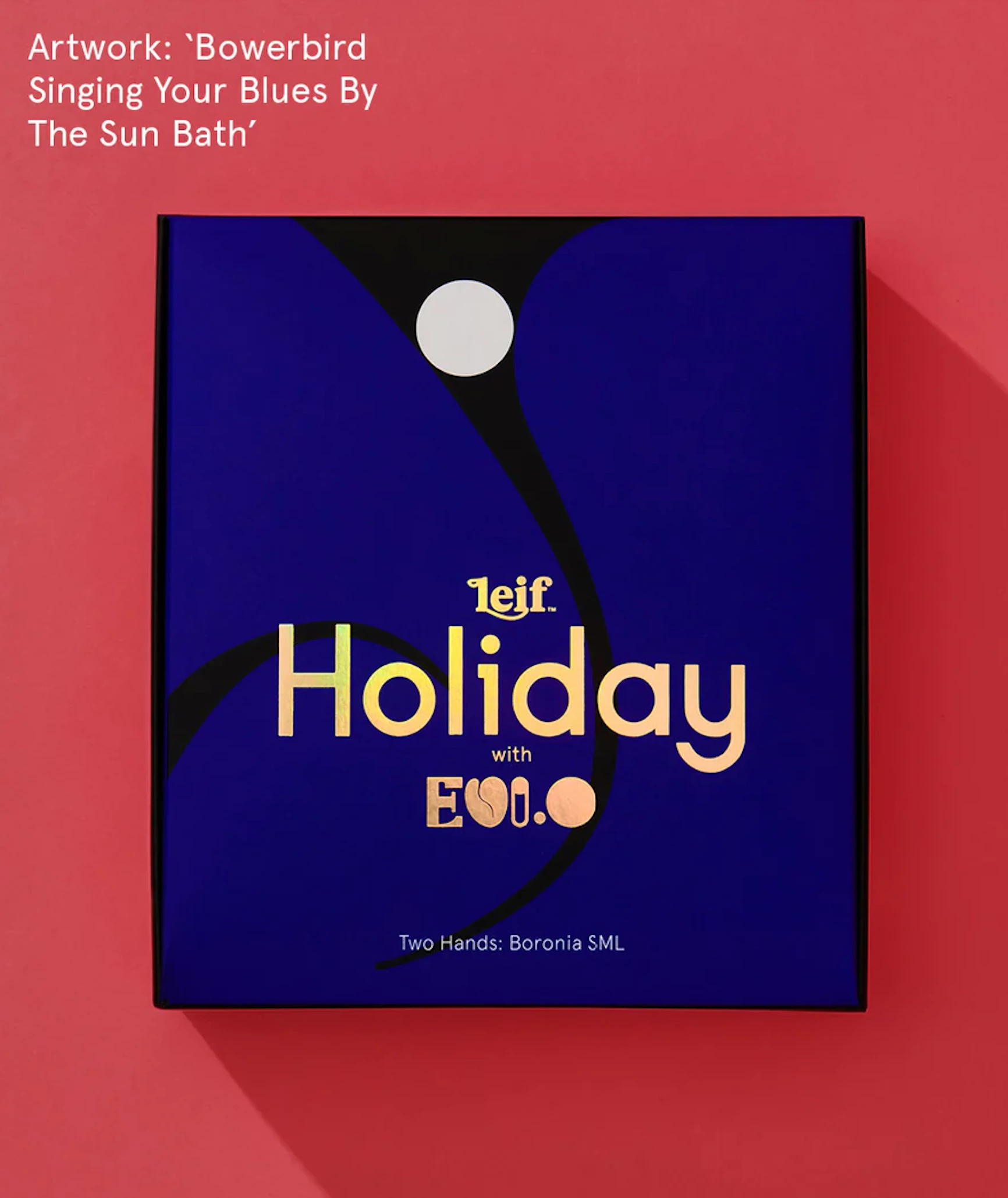 Native wildflower Boronia with Nutgrass, Oud and Patchouli comes beautifully boxed as a colourful Limited Edition artwork by Evi O. Holographic gold foil graphics catch the light and add to the festive feels.