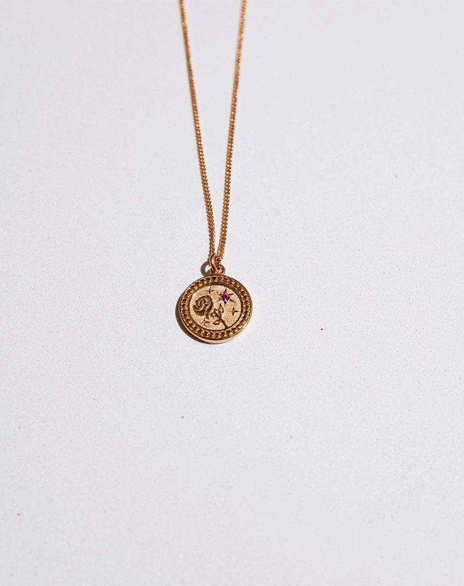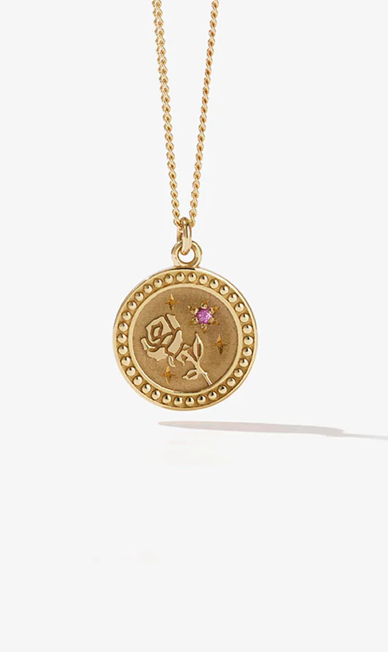 The perfect gift for a loved one, the Amulet Love Necklace by Meadowlark is delicate but full of meaning. A 14mm round pendant designed to be worn layered up with your favourite charms or chains. Featuring a beautiful rose symbolising love for yourself and others. Set with a single 1.5mm round brilliant cut pink sapphire. Hung from a 45cm chain.