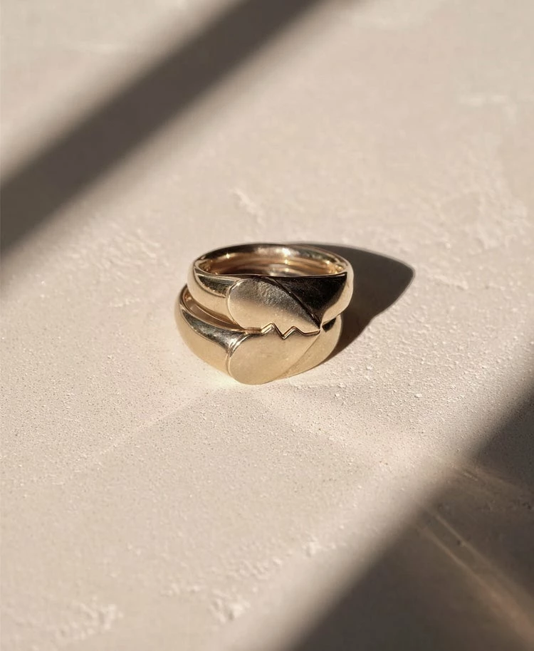 The Meadowlark Broken Heart Rings, Gold Plated. Meadowlark’s take on an enduring, romantic classic. Designed to be worn always, the rings feature a softly curved band for comfort and perfect flat heart top for engraving, if you desire. Sold as a pair to be shared between friends and lovers or kept all to yourself. Â