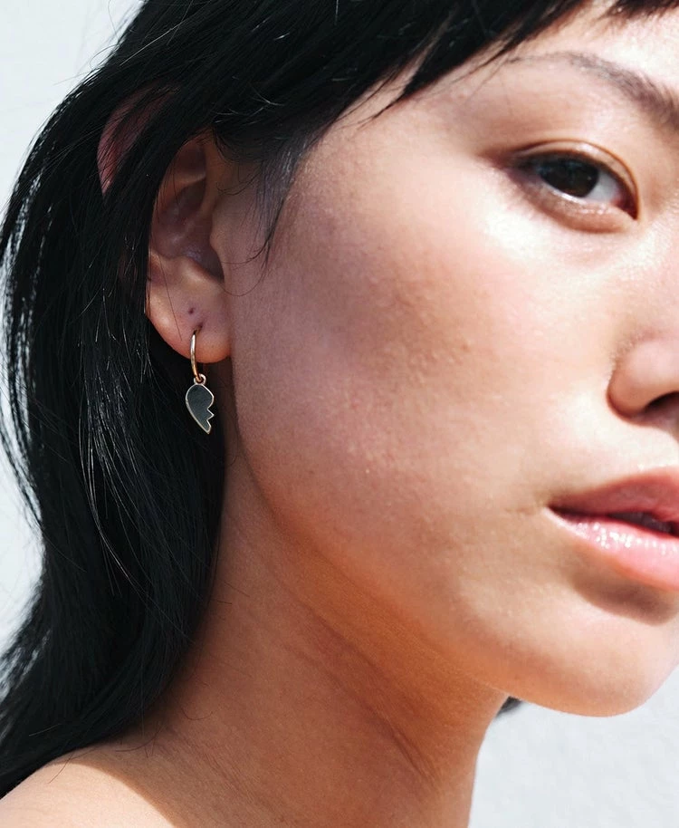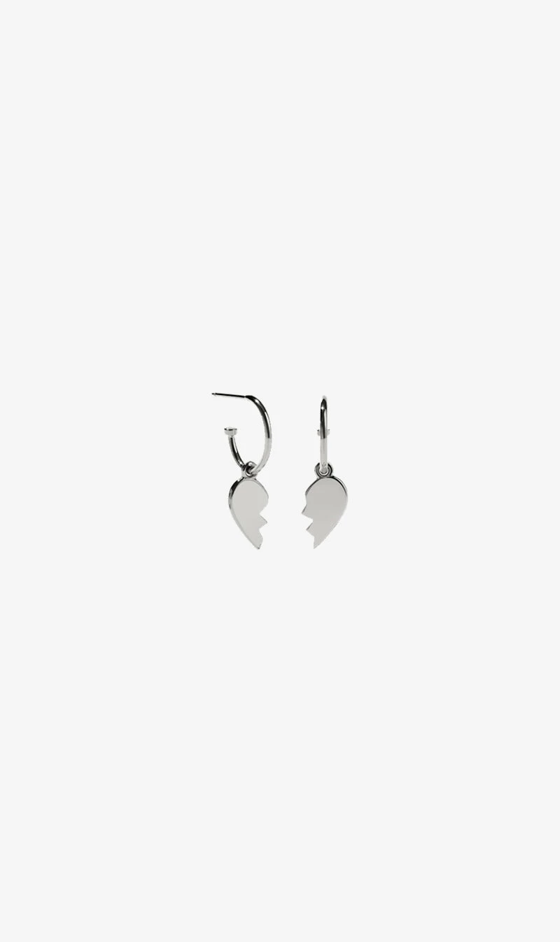 The Meadowlark Broken Heart Signature Hoops in Silver. Meadowlark’s take on an enduring, romantic classic. Suspended from Meadowlark Signature Hoop earrings, the lustrous but unfussy half-hearts are the perfect canvas for love notes or names.
