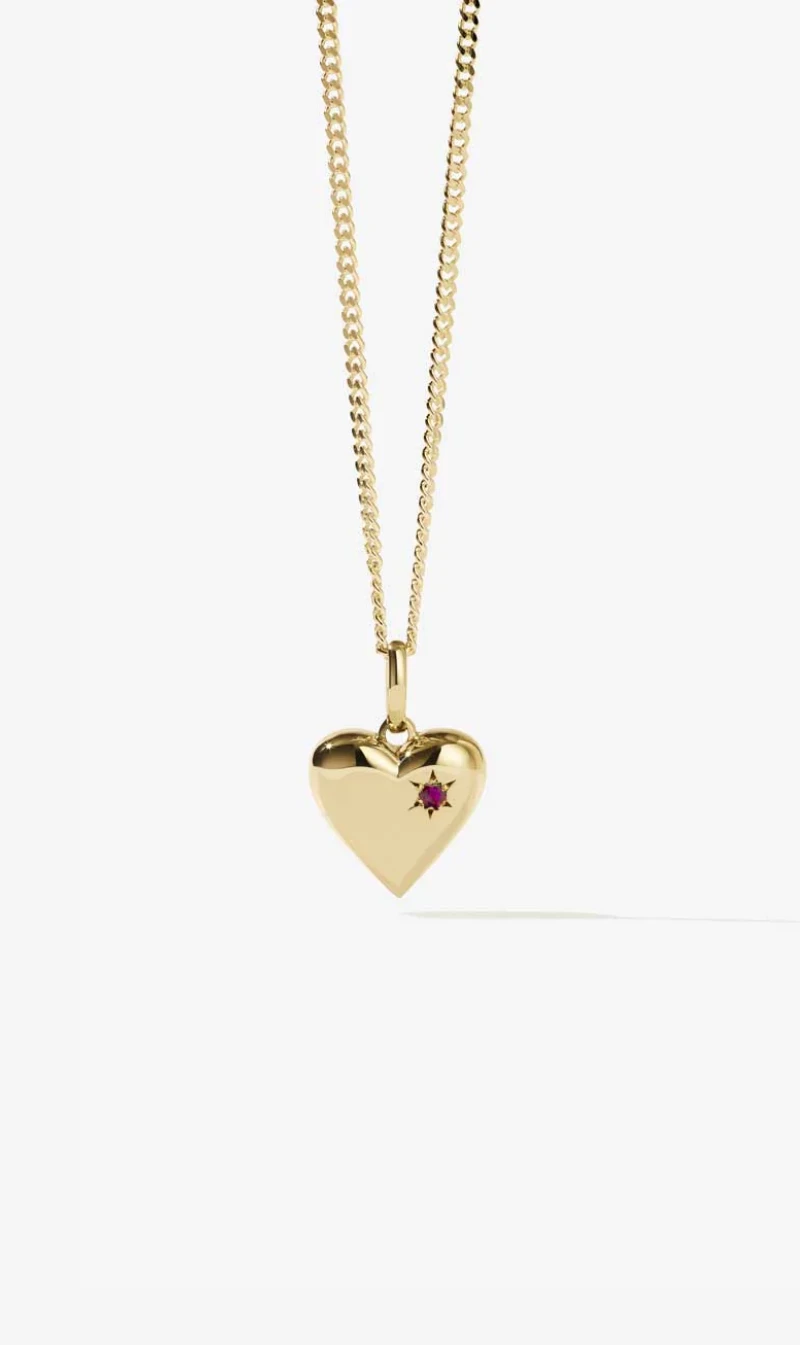 The Meadowlark Camille Necklace Set in Gold Plated / Ruby is a universal symbol of affection and adoration, this full and rounded love heart bears a tiny star-set stone and is suspended from a fine 50cm diamond curb chain. A forever piece to give extra sparkle to you or someone special. Thoughtfully crafted with 23k plated gold.