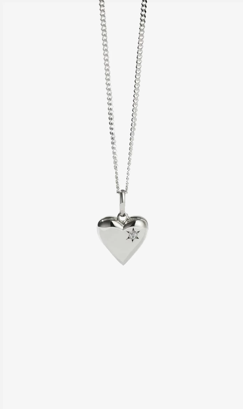 The Meadowlark Camille Necklace Set in Silver / White Diamond is a universal symbol of affection and adoration, this full and rounded love heart bears a tiny star-set stone and is suspended from a fine 50cm diamond curb chain. A forever piece to give extra sparkle to you or someone special.Â
