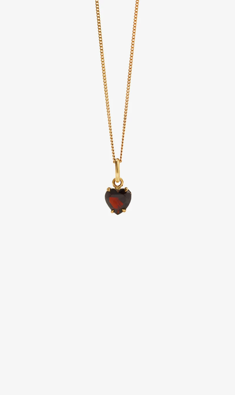 The Meadowlark Heart Jewel Necklace in 9ct Yellow Gold. A pillowy 7mm heart-shaped stone, hugged by a simple claw setting and suspended from a fine and delicate chain. Pared-back but bursting forth – an everyday ode to loving and being loved.Â