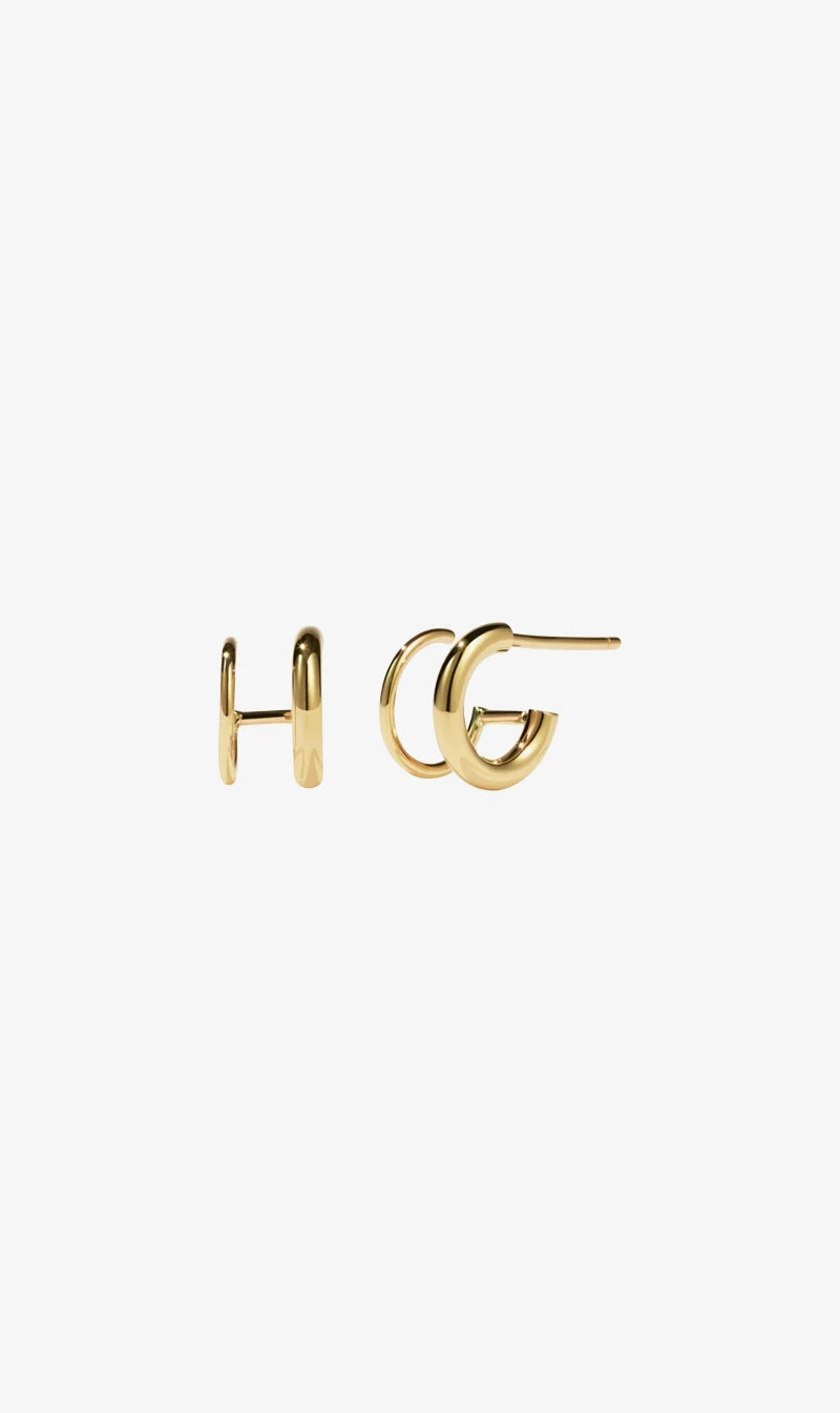A large and small gold hoop are connected by a concealed joint to give the illusion of a double piercing. A minimal, cool and unfussy mood. Â