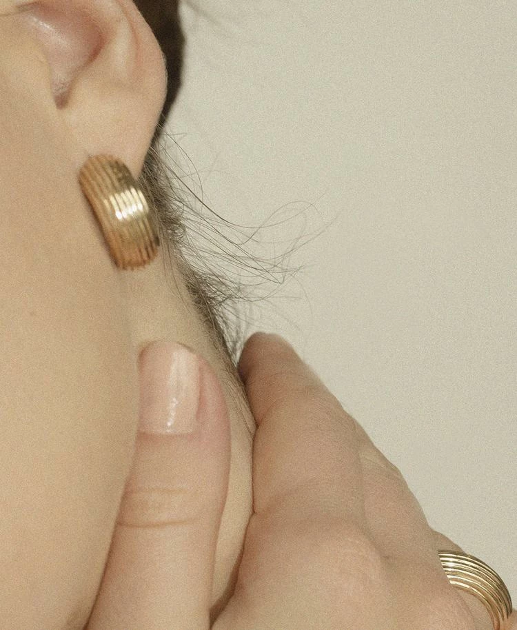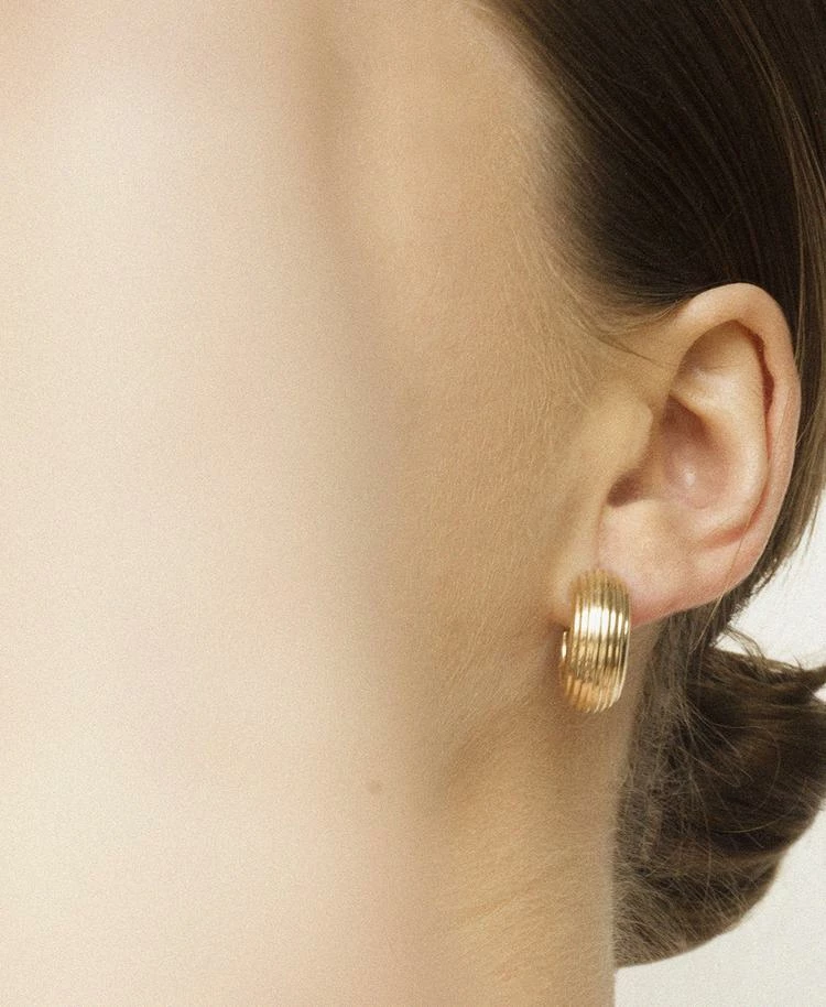A mid-sized hoop with a series of soft repeating lines that add texture and invite play between light and shadow. Vintage-inspired opulence for everyday. Fastened with our Signature Silicone Backs.