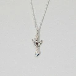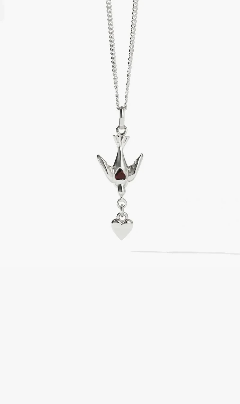 The Meadowlark Love Dove Necklace Set in Silver is a symbol of peace, hope, and freedom, this intricately-sculpted dove charm flies forever with a love heart in its beak and garnet at its breast, here suspended from a delicate 50cm chain. A talisman to treasure for the unbreakable dreamer, lover, and optimist. Carefully crafted from sterling silver.