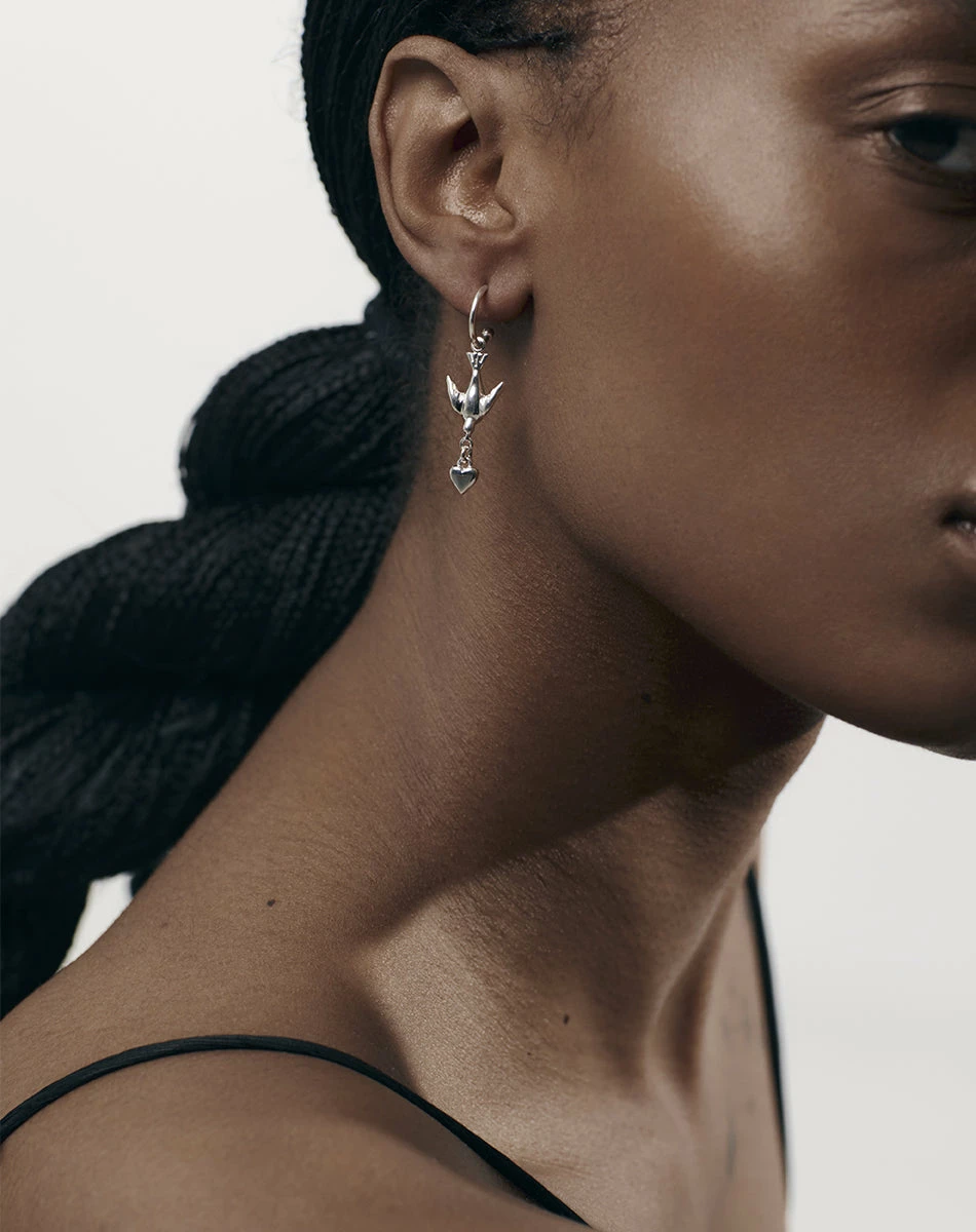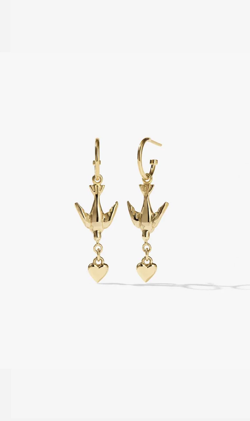 The Meadowlark Love Dove Signature Hoop in Gold Plated is a symbol of peace, hope, and freedom, this small and intricately-sculpted dove charm flies forever with a love heart in its beak. Suspended from our signature hoops; a sweet piece for the unbreakable dreamer, lover, and optimist. Pair it with the Love Dove Necklace 50cm in Gold Plated to complete the look.Â