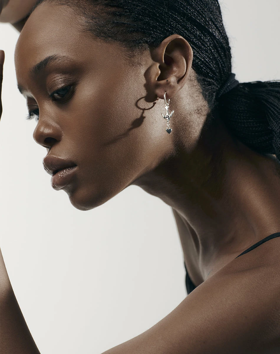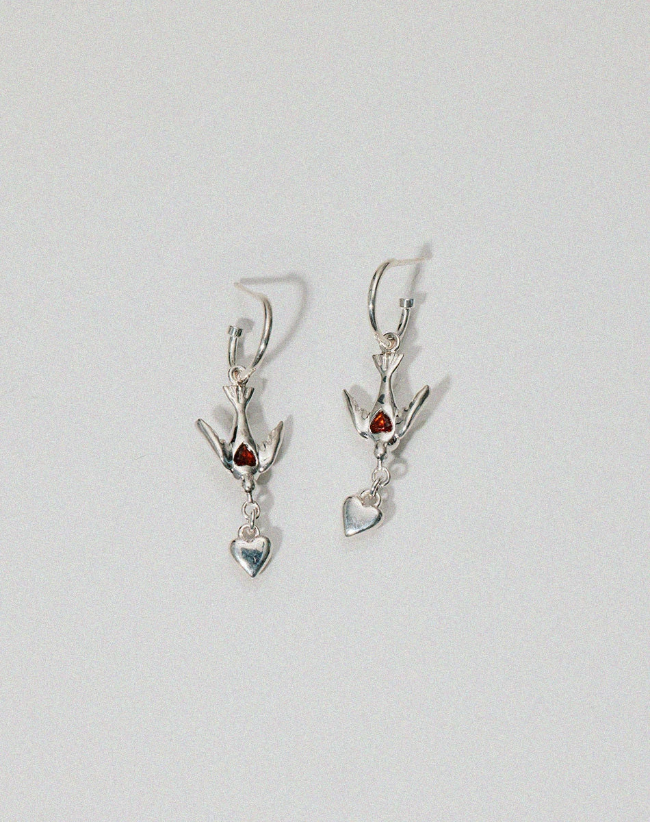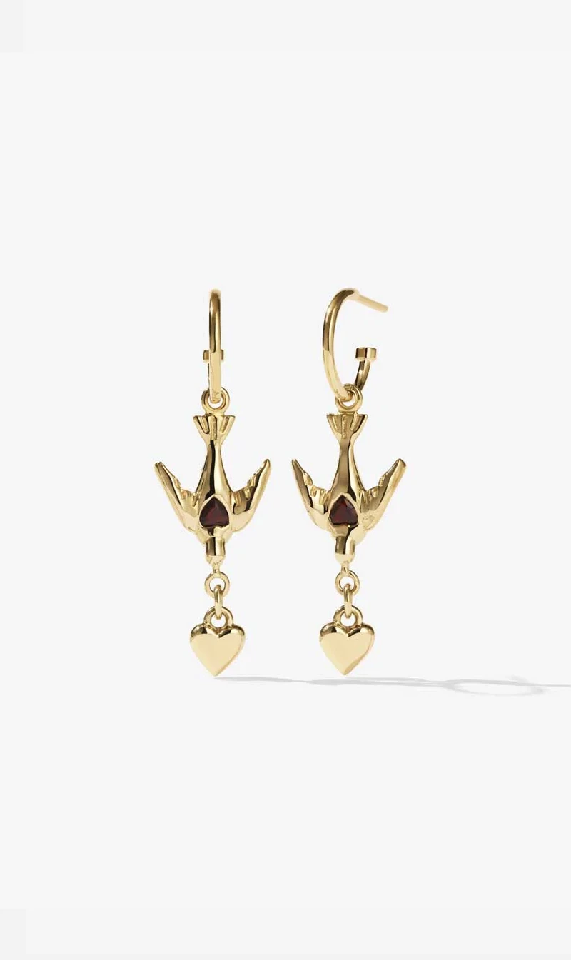 The Meadowlark Love Dove Signature Hoop Set in Gold Plated is a timeless style with a modern spin. A symbol of peace, hope, and freedom, this small and intricately-sculpted dove charm flies forever with a love heart in its beak and a garnet at its breast, here suspended from our signature hoops. A talisman to treasure for the unbreakable dreamer, lover, and optimist. Thoughtfully crafted using plated gold.