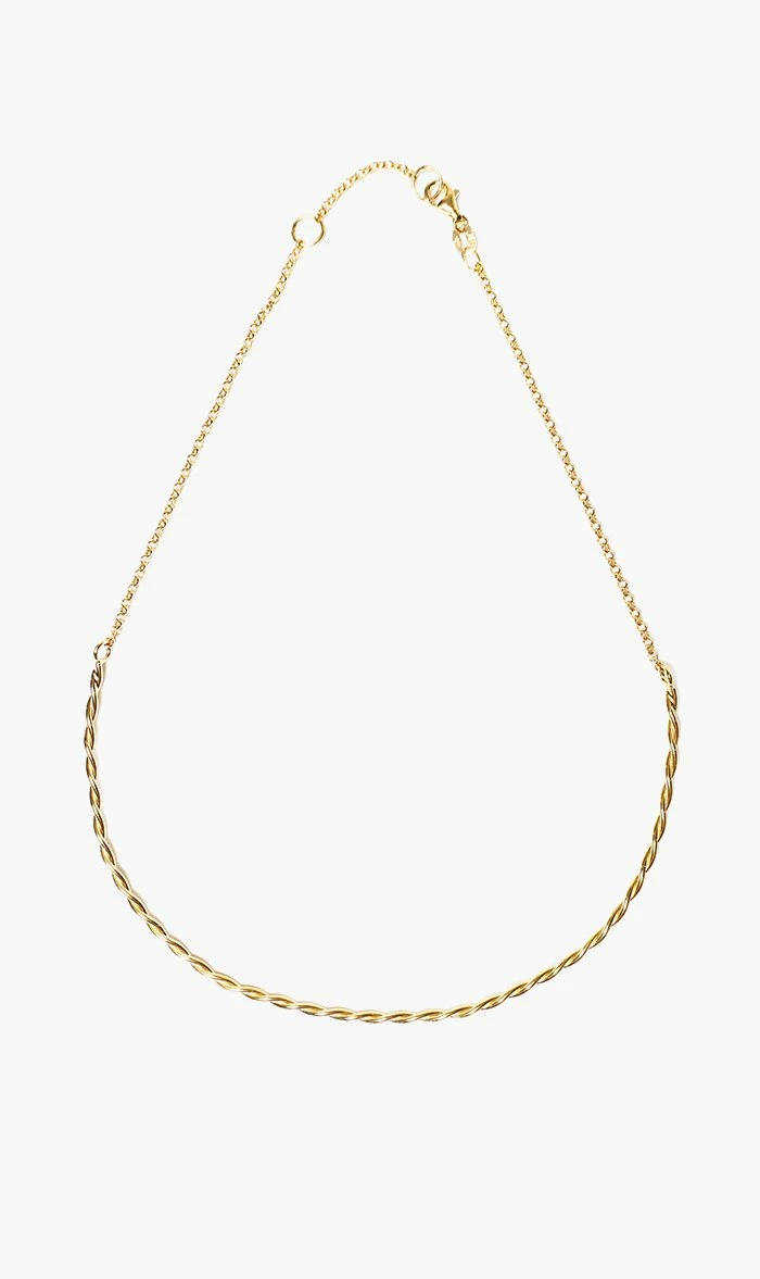 The Natasha Schweitzer Helix Choker is handmade from 14K Gold Plated Sterling Silver. Featuring a twisted design, the choker is to be worn high and fitted on the neck. The chain has two adjustable lengths, and measures approximately 37cm at its longest length.