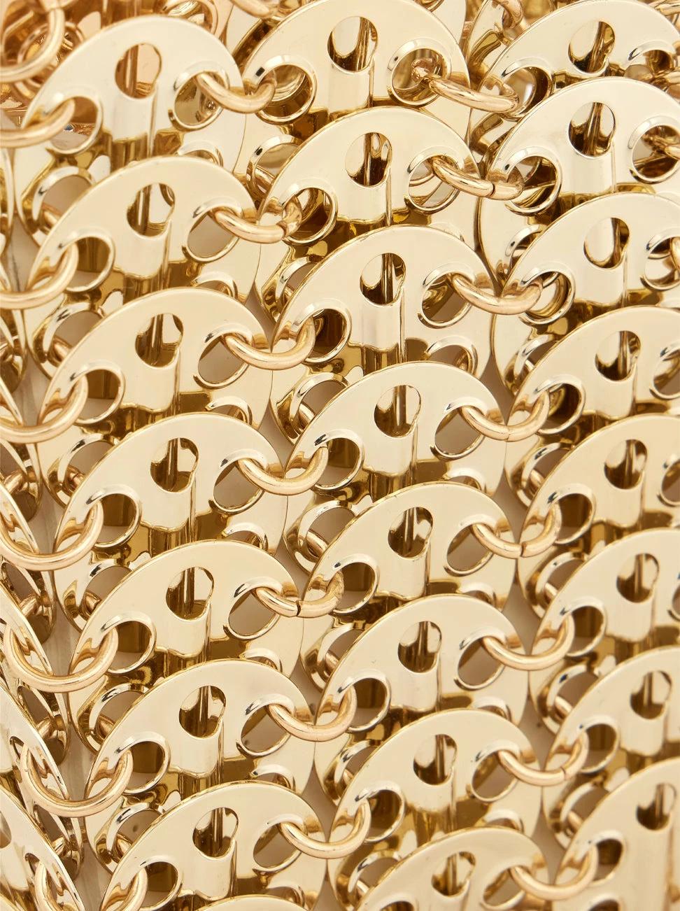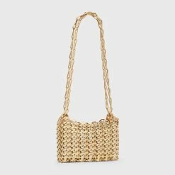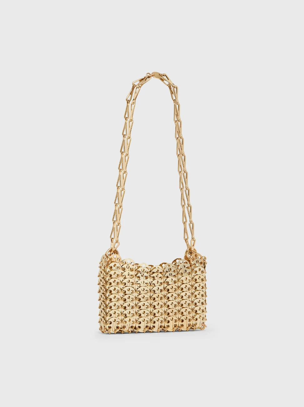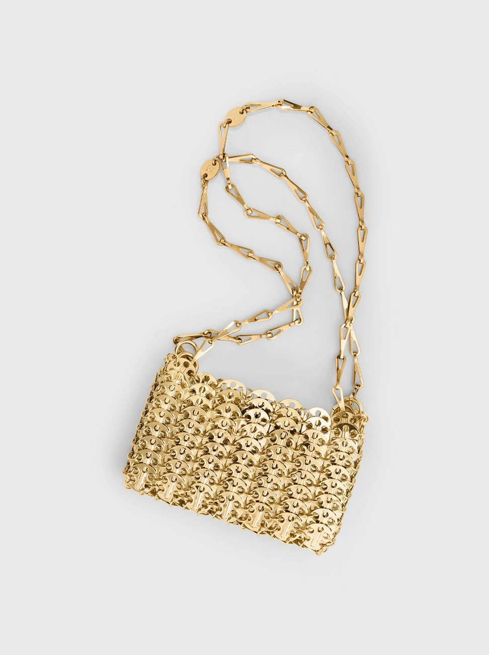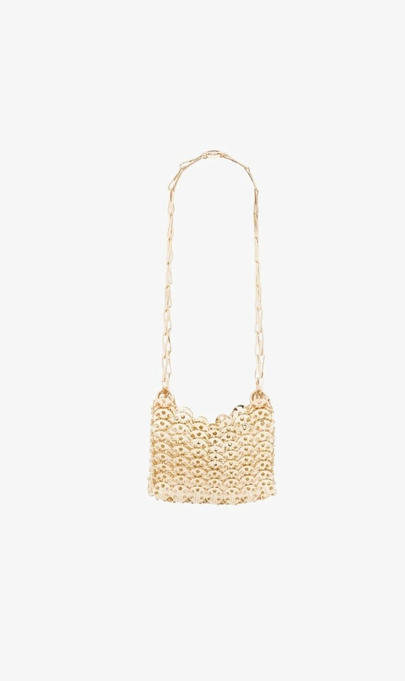 The fabulously fun Nano Pochette by Paco Rabanne is a reissue of the Iconic 69 bag and shows the identity and know-how of House Paco Rabanne. The gold purse is a new format of the Iconic brand 1969 and comprises gold metallic pellets with a pellet bearing the “PR” of Paco Rabanne on the chain. These iconic bags can be worn on or over the shoulder for a complete party look.