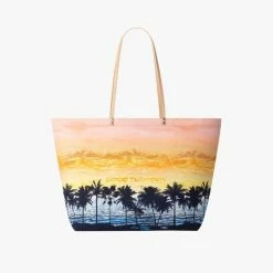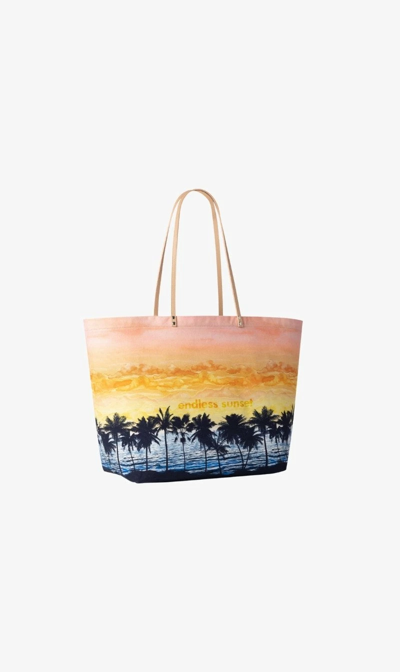 Large tote bag made of recycled cotton canvas printed with the “Sunset” pattern from the Prêt-à -porter collection. Black cotton drill lining. Inside floating pocket that can hold a phone or a wallet. Signature woven patch, signature of the Summer Holiday capsule.Â